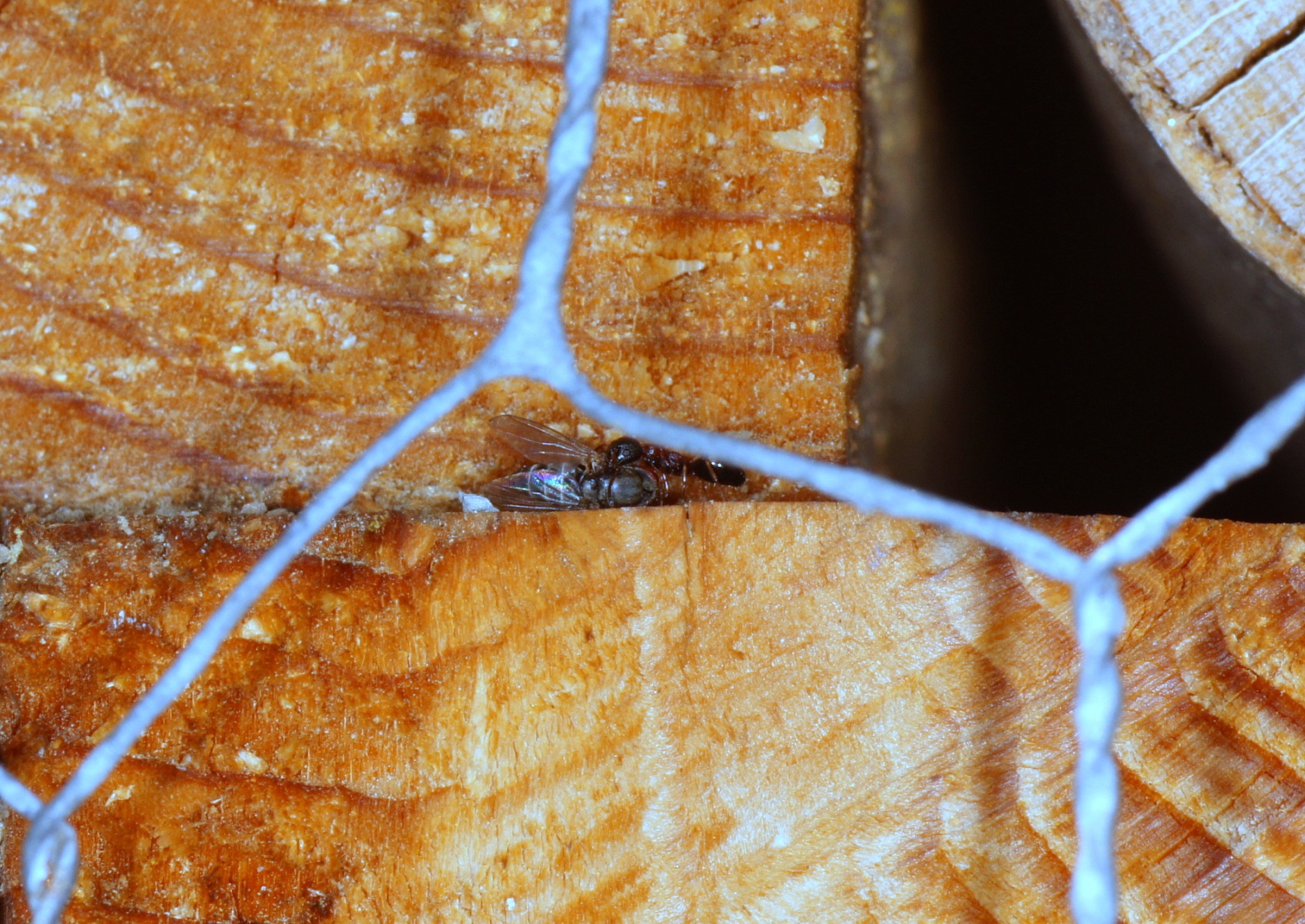 Könnte die Arbeiterin eine dieser Fliegen erbeutet haben? Sehr unwahrscheinlich, dazu ist Dolichoderus nicht in der Lage; ein totes Exemplar könnte aber zur Beute geworden sein.