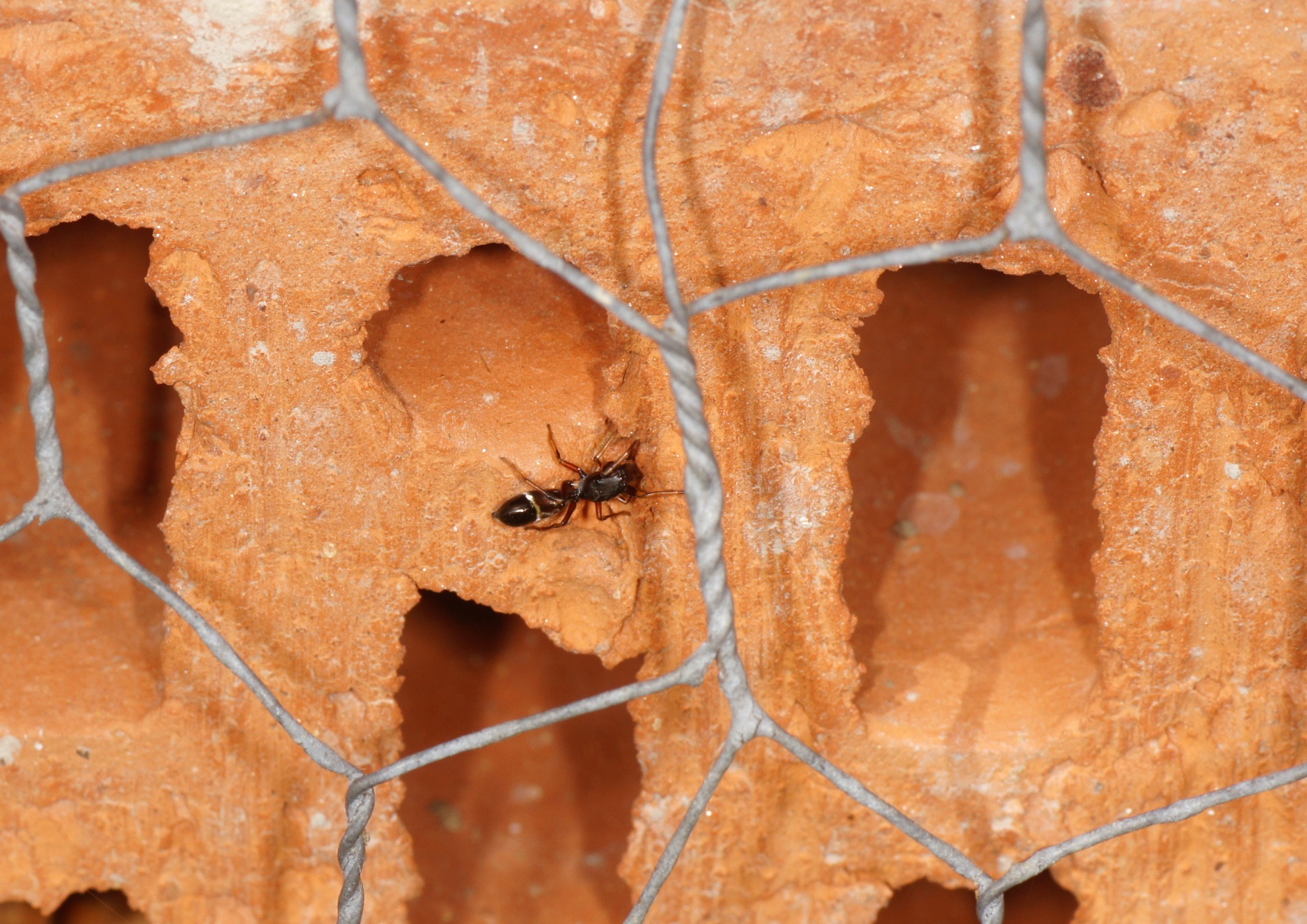 Dolichoderus quadripunctatus bewohnt inzwischen mehrere "Zimmer" im Hotel, zwischen diesen herrscht pausenlose Besuchsaktivität
