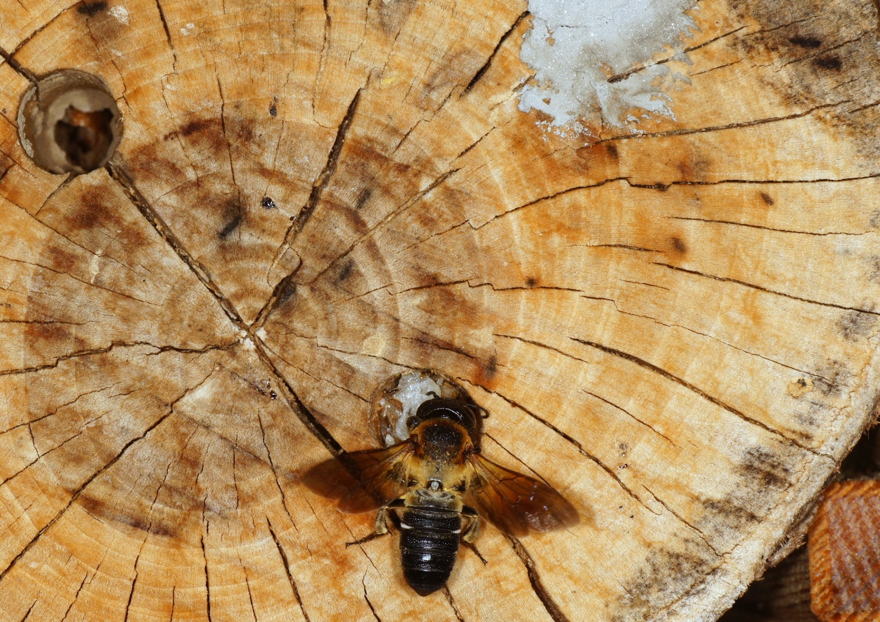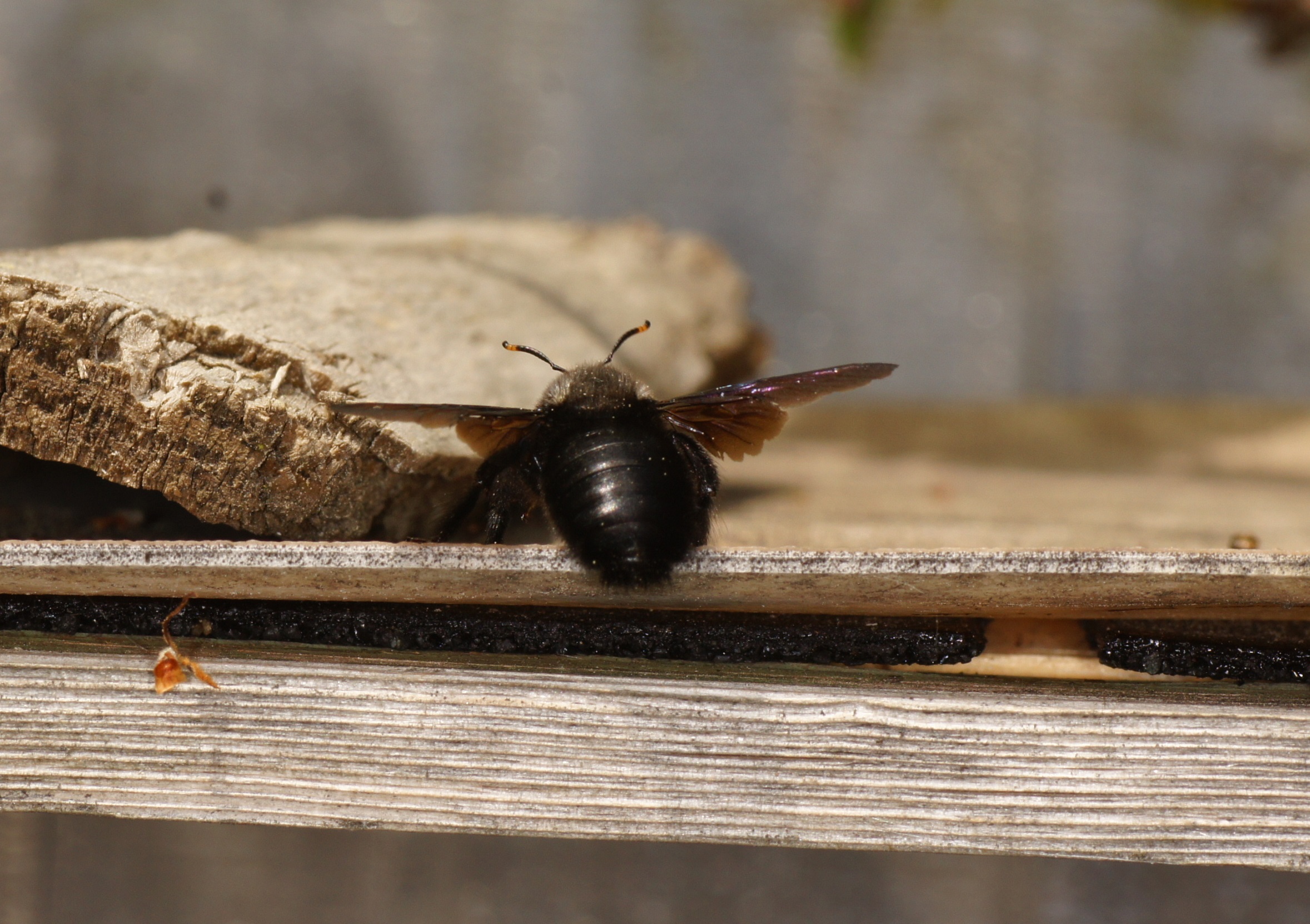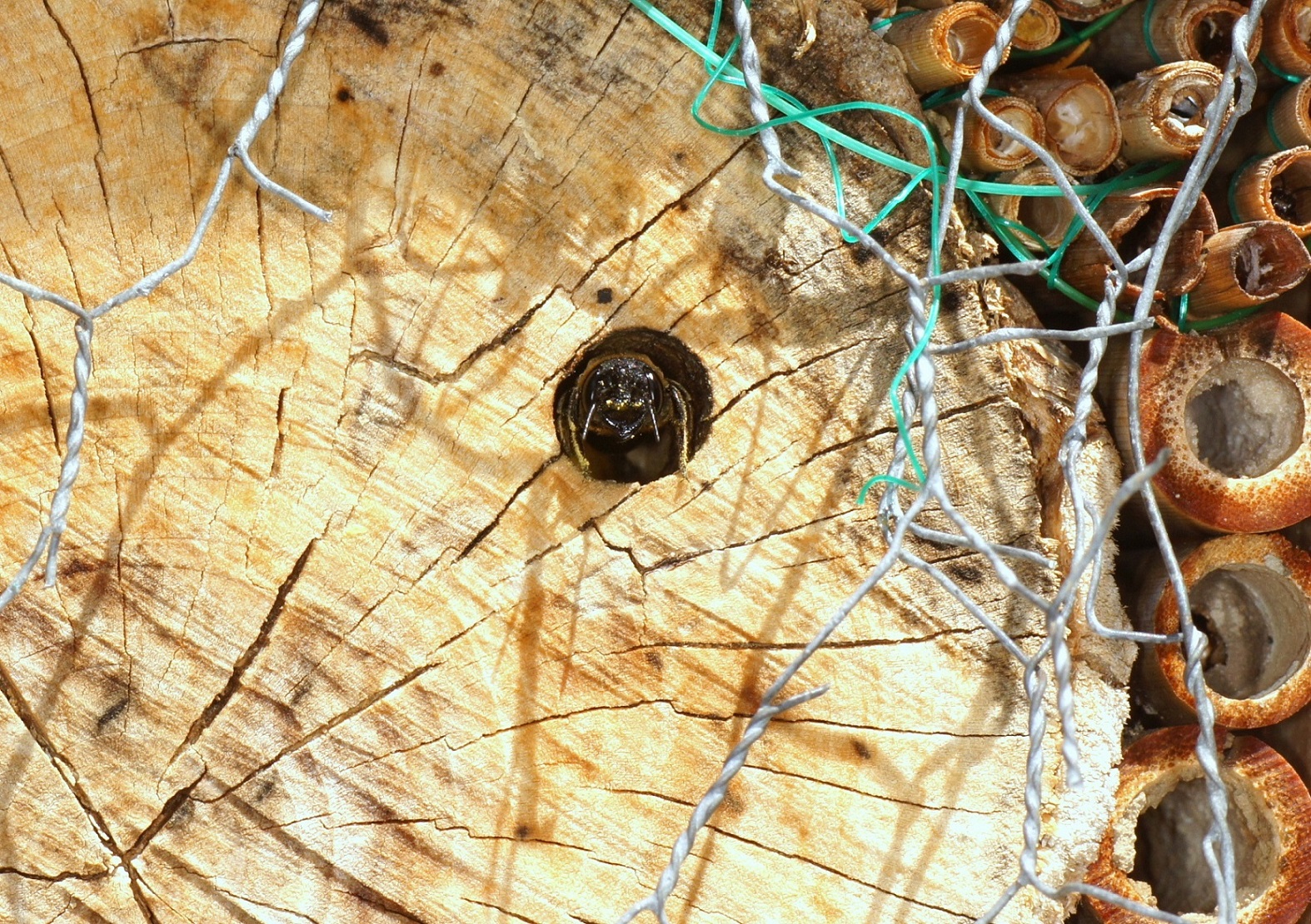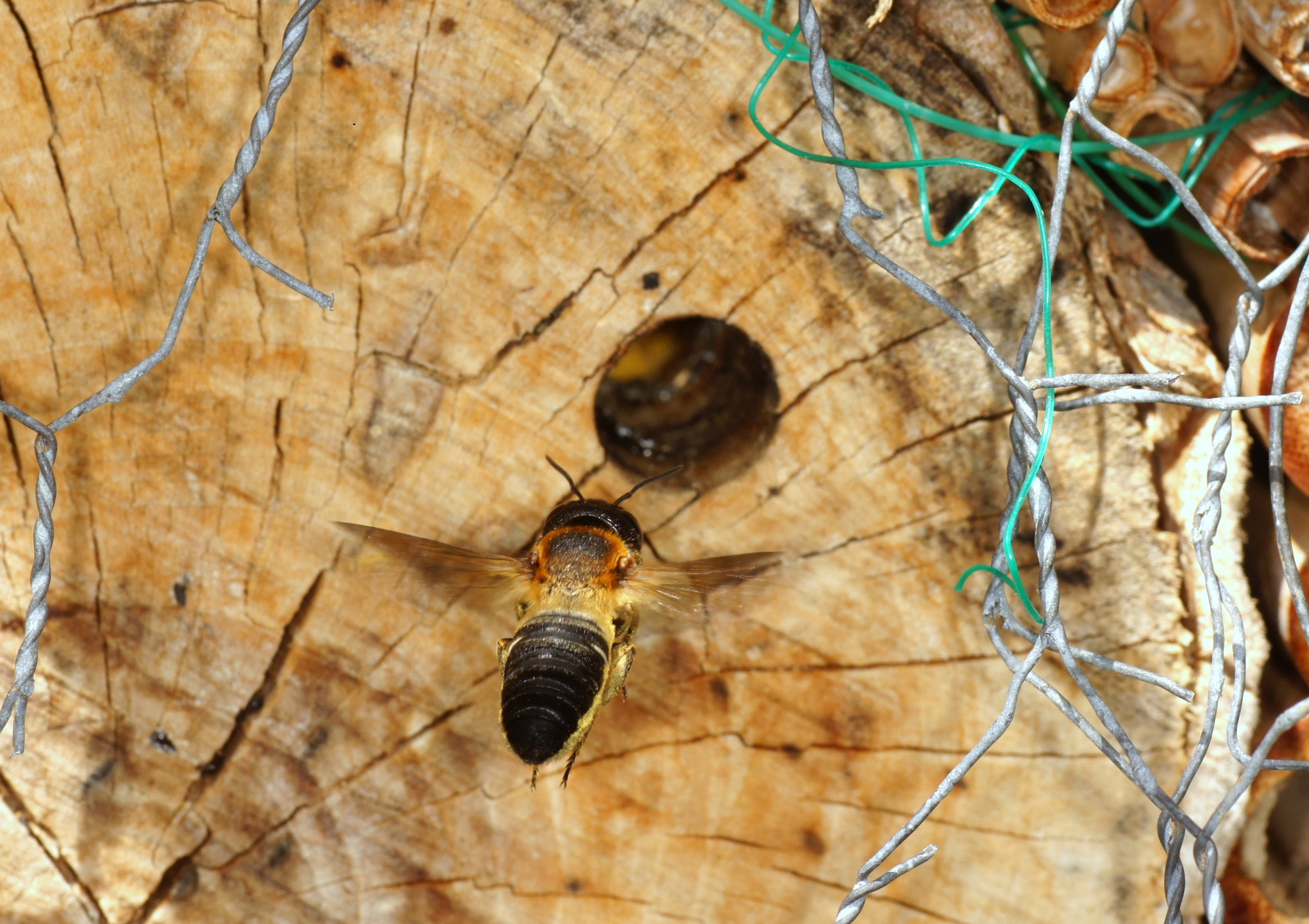 Ich versuche die Art seit Jahren mit unterschiedlichstem Totholz anzulocken. Leider spricht der Zeitpunkt eher gegen Xylocopa, denn die gründen eigentlich viel früher im Jahr. Bestimmt wird sich der Neuling bald zeigen.