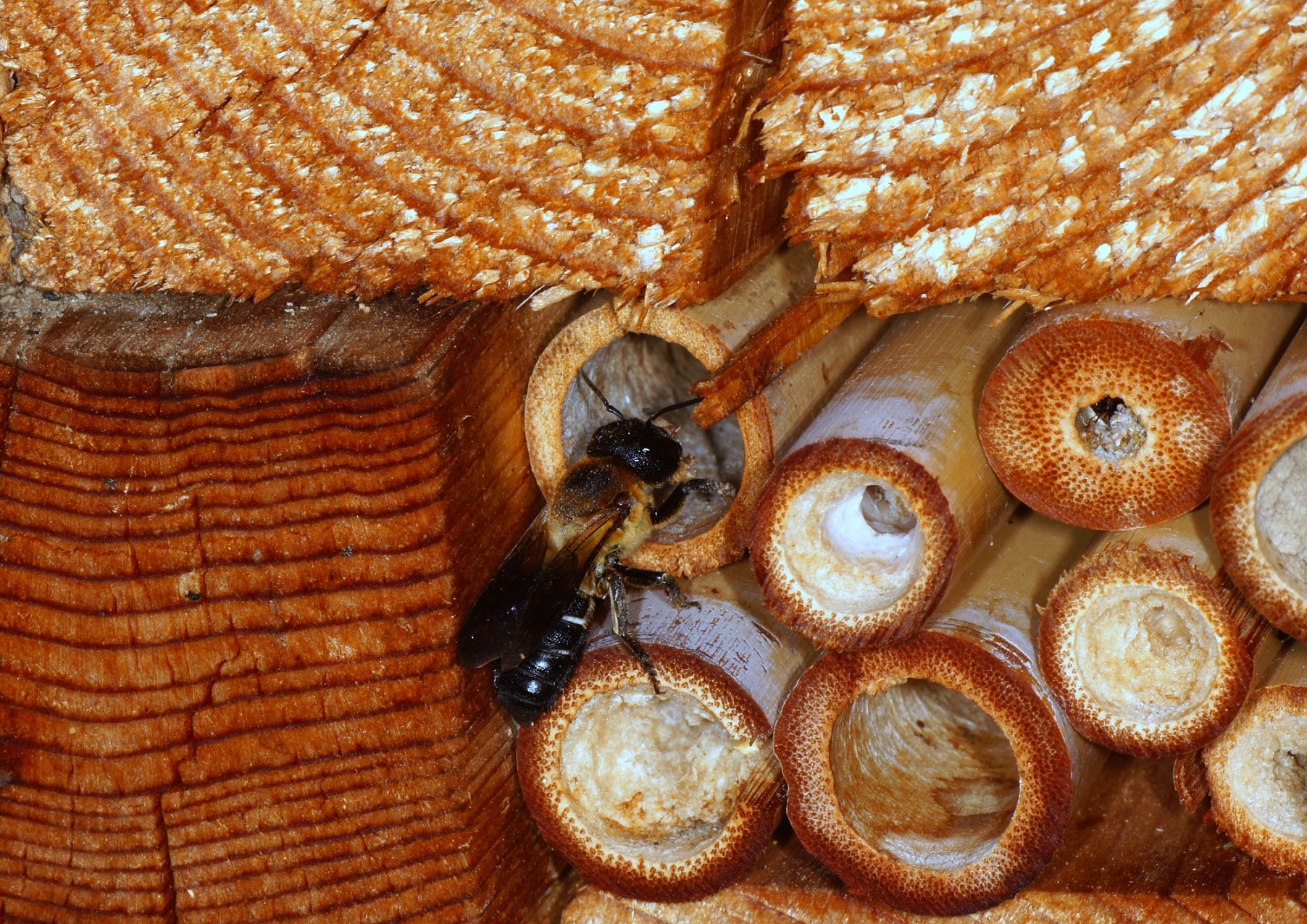 P.S.: Nachdem die Biene die erste Brutröhre verschlossen hatte (siehe oben), hat sie nun die nächste Röhre besiedelt!