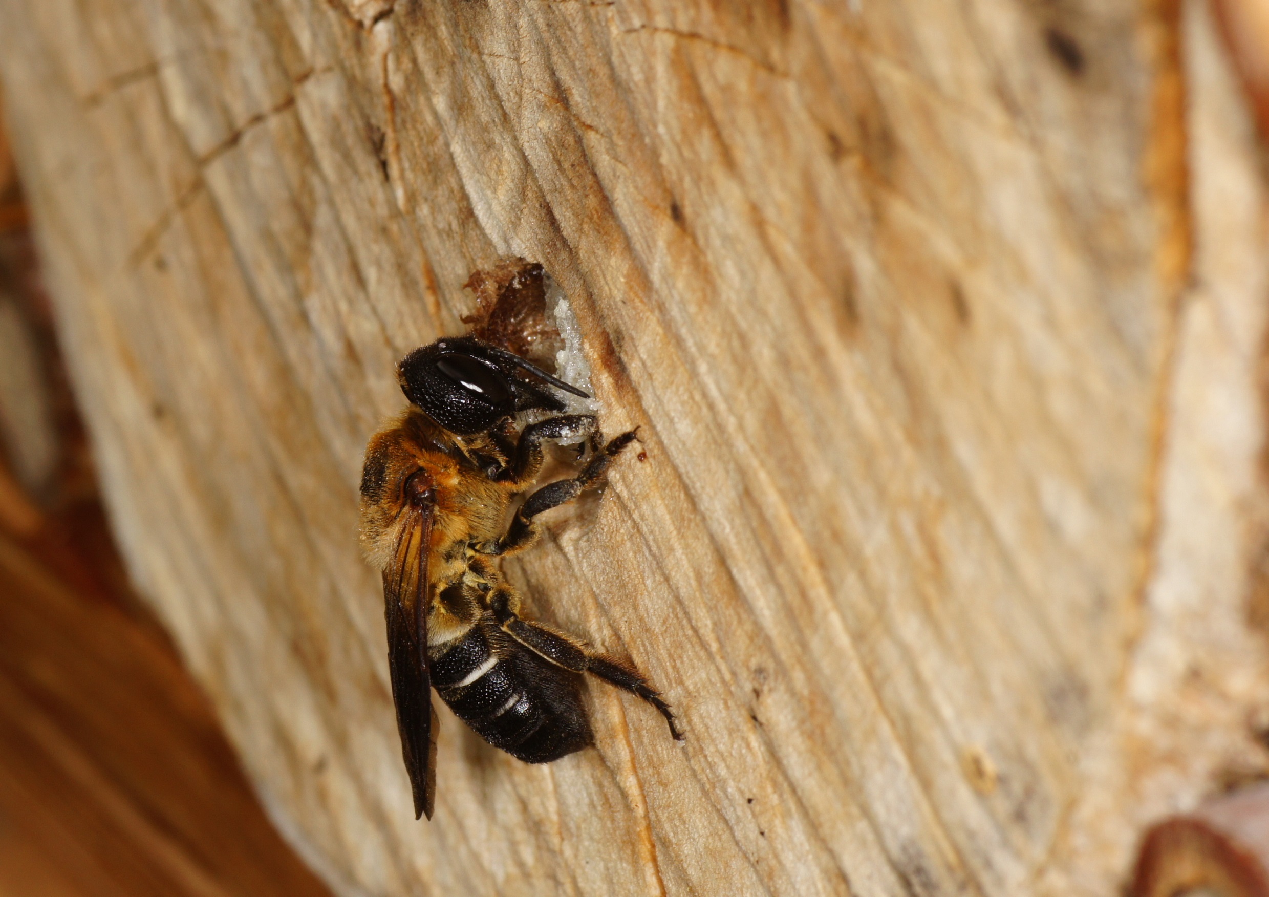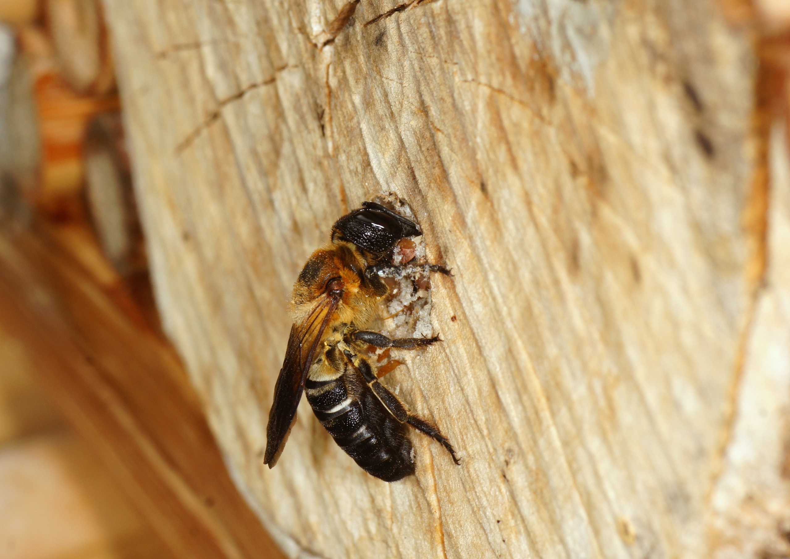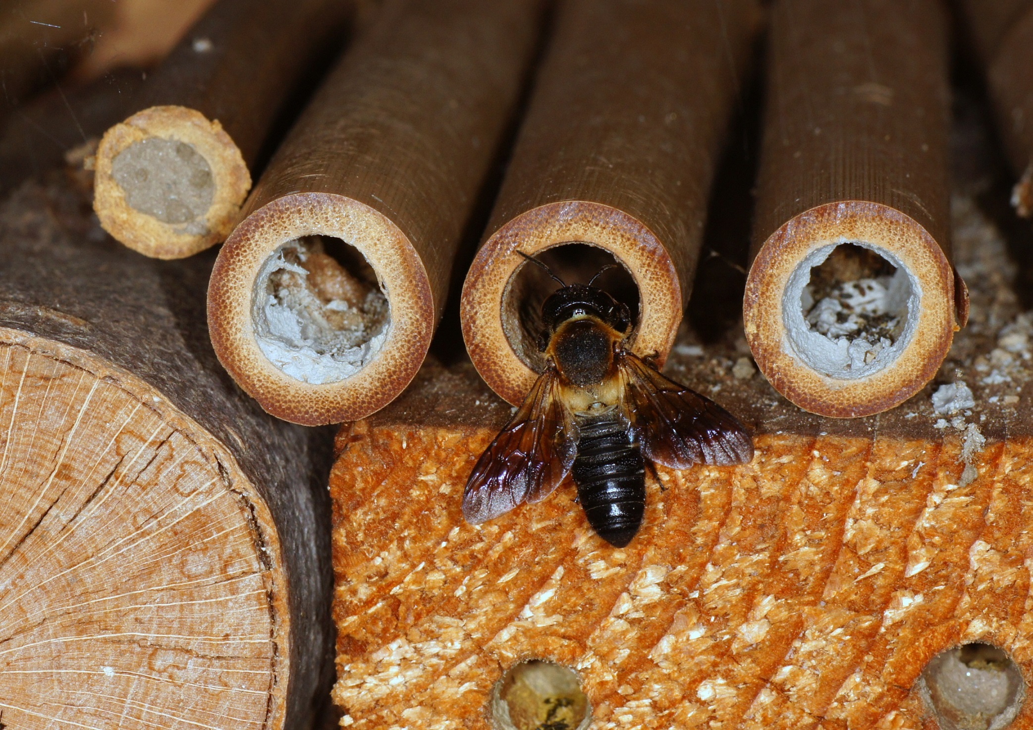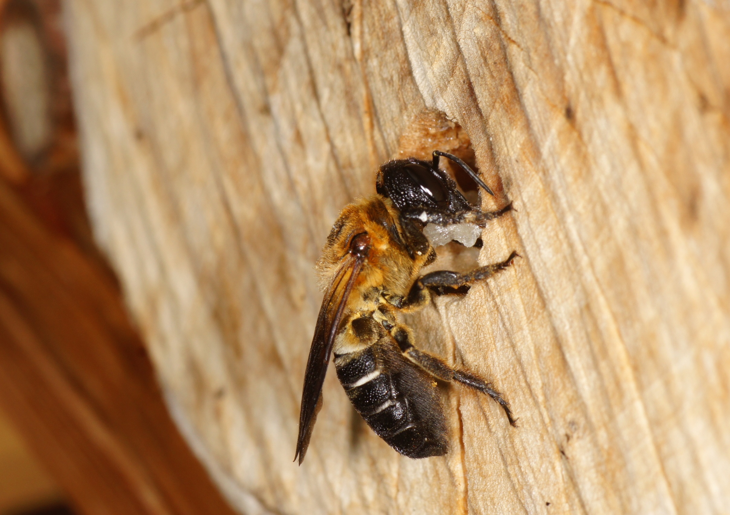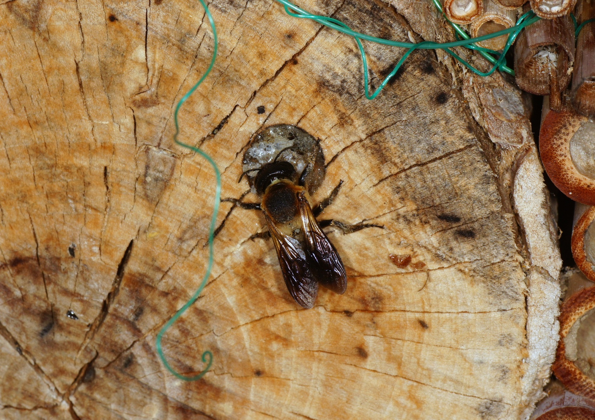 Zusätzlich scheint es die einzige Bienenart zu sein, die zur Verkleidung der Innenräume, der Trennwände zwischen den einzelnen Abteilungen und des Außenverschlusses Harz von Nadelbäumen verwendet und mit kleinen Holzpartikeln oder Lehm mischt. Das scheint mir eine recht stabile Verbauung zu sein, die ein Eindringen von Parasiten erschweren dürfte. Von den heimischen Megachile-Arten ist eine derartige Verbauung unbekannt, diese verwenden oft Blatt- und Pflanzenmaterial ("Blattschneiderbienen").