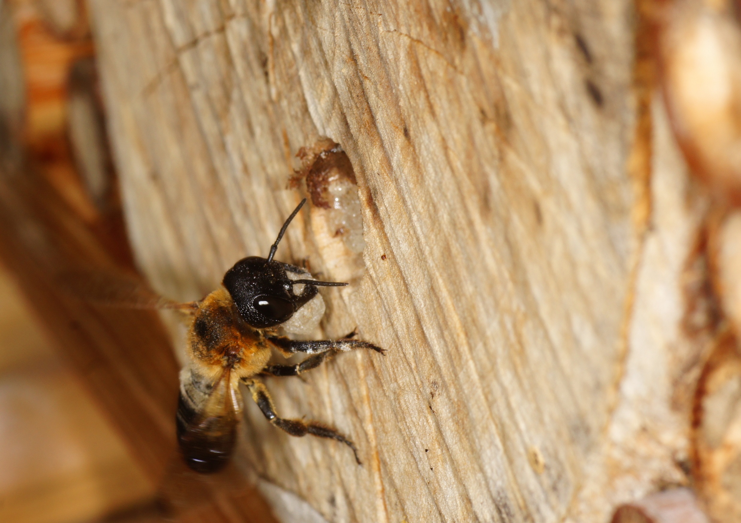 wo sie sich an den Futtervorräten gütlich tun. Im Normalfall schaden sie der transportierenden Biene nicht so sehr, schädigen oder vernichten aber ihre Brut. Bei einer so großen