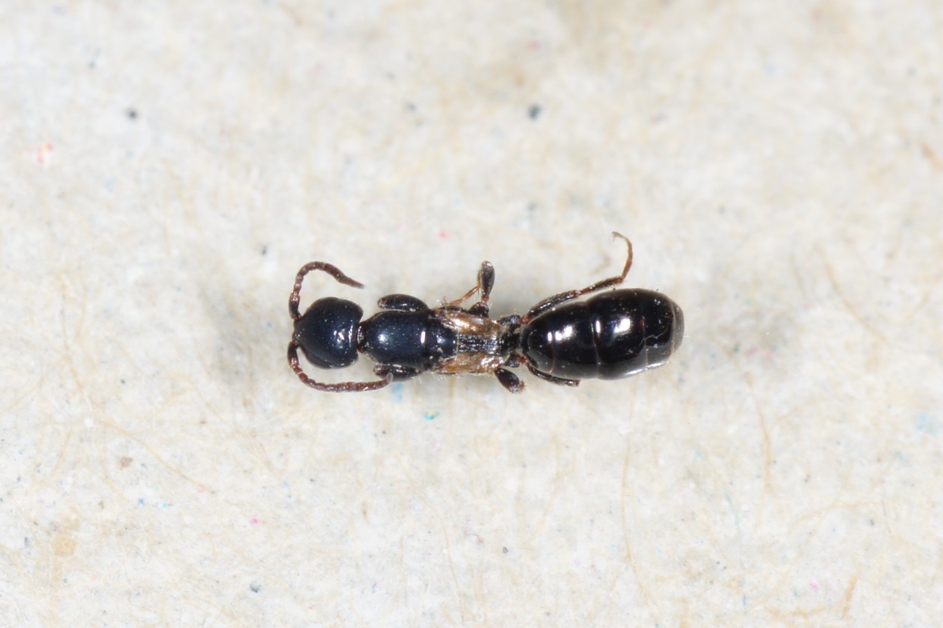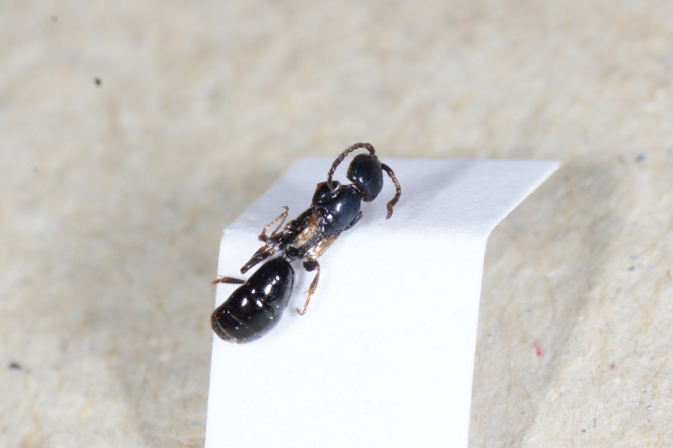 Bei der Durchsicht v. Belegen, die mir ein Kollege von der östlichen Grenze Österreichs (zur Slowakei) mitgebracht hat, fand ich dieses Exemplar neben ein paar Mutillidae (Ameisenwespen). Auf den ersten Blick denkt man an eine Ponera sp. (aber ohne Petiolus!). Deuten die kurzen Flügelstummel auf einen Kurzflügler (Staphylinidae) hin? Wohl nicht, die deutliche Abschnürung zwischen Mesosoma und Gaster sowie der ausgefahrene Stachel auf einem der Bilder deuten auf eine Wespe hin. Das Tierchen ist knapp 5 mm lang. Hat jemand eine Ahnung was es sein könnte?