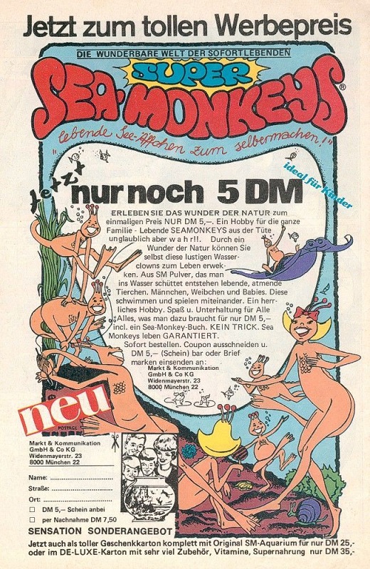 "Ein Hobby für die ganze Familie. Lebende SEAMONKEYS aus der Tüte, unglaublich aber wahr! Durch ein Wunder der Natur können Sie selbst diese lustigen Wasser-Clowns zum Leben erwecken. Aus SM Pulver, das man ins Wasser schüttet entstehen lebende, atmende Tierchen. Männchen, Weibchen und Babies. Diese schwimmen und spielen miteinander. Ein herrliches Hobby. Spaß u. Unterhaltung für Alle.“