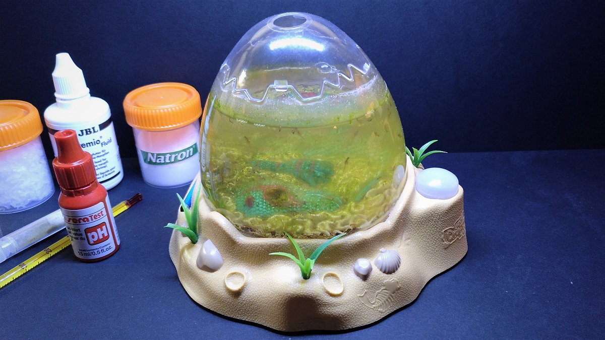 Grundsätzlich gilt, dass es in derart kleinen Behältnissen bei einer Wassermenge zwischen 300ml und 350ml unmöglich ist, das Wasser (ohne eigenes Zutun) über einen längeren Zeitraum sauber zu halten. Futterreste, Ausscheidungen und Häutungsreste der Artemien etc. lassen daraus schon bald eine trübe Brühe werden. Dass sich die Tiere darin irgendwann nicht mehr wohl fühlen , kann man auch sehr gut an ihrem Verhalten ablesen: Sie werden (trotz gleichbleibender Wassertemperaturen und guter Belüftung) mehr oder weniger plötzlich "schlapp", fangen an, vor sich hin zu dümpeln und versterben letztendlich.