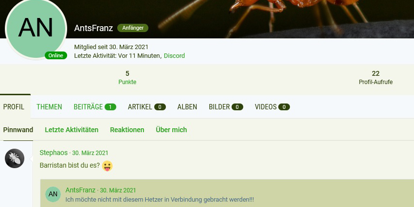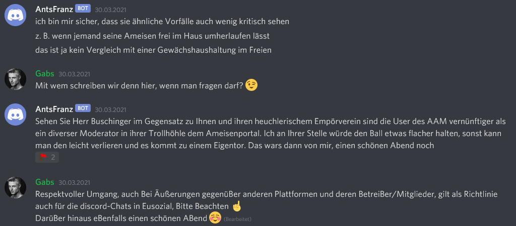 Im AAM-Discord wird „AntsFranz“ zur Ordnung angehalten (30.3.21). Später ist er dort gebannt.