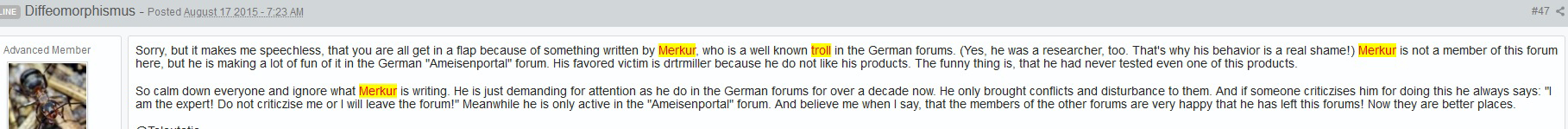 Ich wurde aber von besagtem User über mehrere Jahre in praktisch allen Ameisenforen verfolgt, z. T. auf widerlichste Weise. „Empfehlungen“, mich mit „Barristan“ privat auseinander zu setzen usw. habe ich genügend bekommen. Und erfahren müssen, dass kaum jemand sich mal inhaltlich mit der Sache befasst hat. Man hat kollektiv die Augen geschlossen und mir eine (Mit-)Schuld angehängt!
