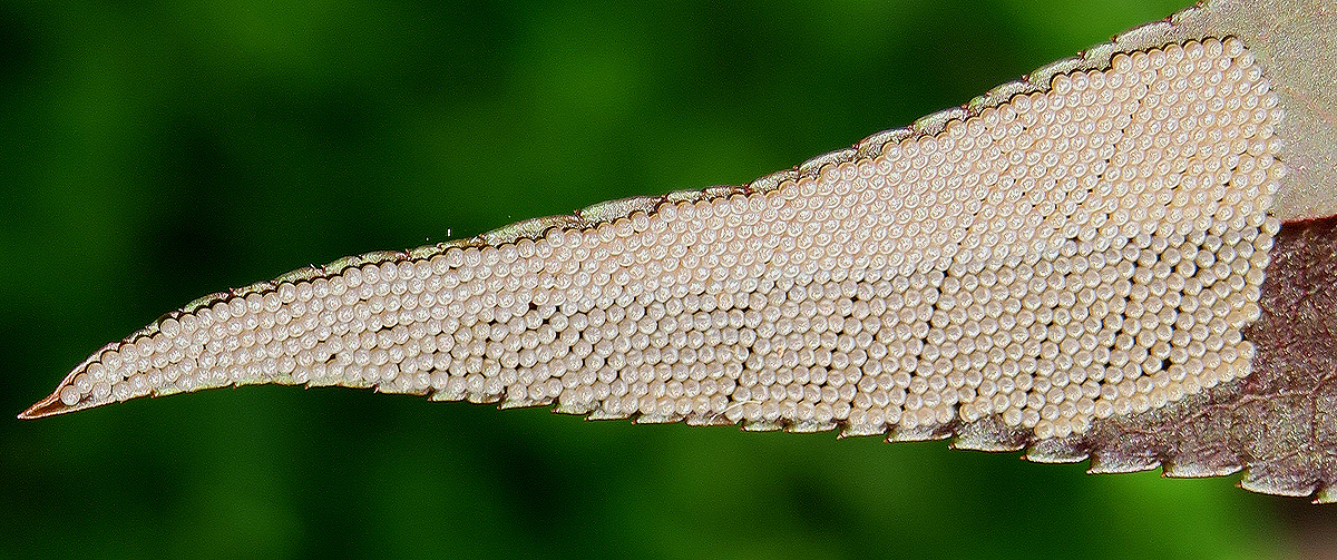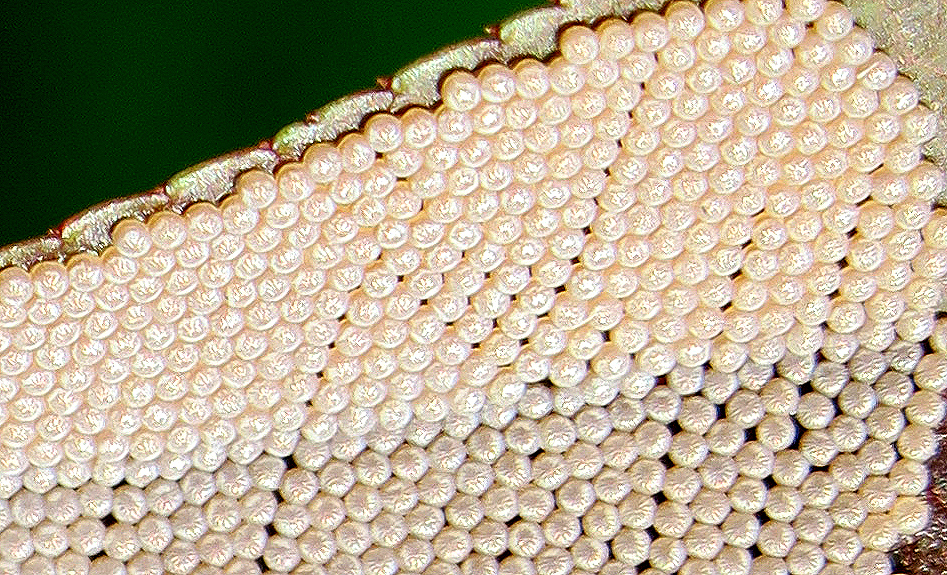 Es sind 909 Eier. Unwillkürlich versucht man hier auch herauszufinden, wo der Falter das erste davon mit seinem Hinterleibsende ablegte. Es muss die äußerste Blattspitze gewesen sein.