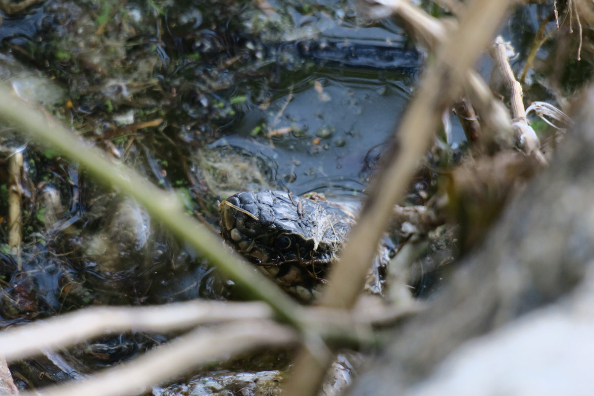 Leider konnte ich nur das eine Foto schießen, dann war die Schlange abgetaucht. Es ist eine einheimische Art.