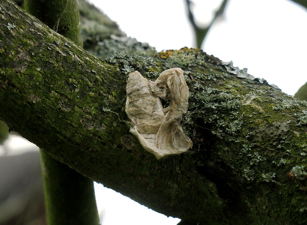 wie die Kokons auf den Baum gekommen sind. Am Boden, wo sie zwischen Halmen von Gräsern und anderen Pflanzen verankert waren, muss sie der Wind herausgelöst haben. Dann aber sind es ca. 2 – 2,5 m im 45°-Winkel aufwärts in den Baum.