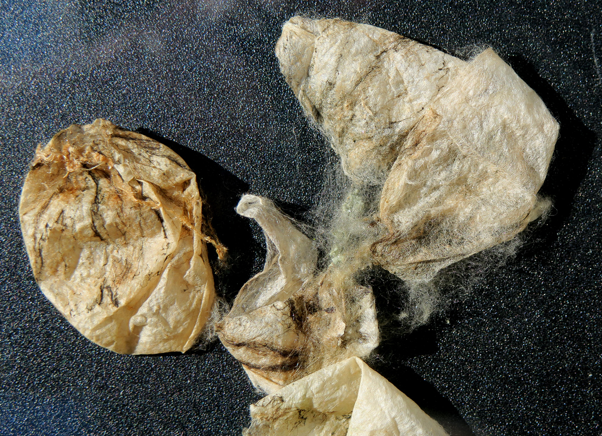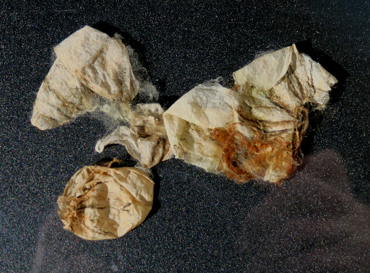 Ich habe diese Kokons heute auf eine schwarze Unterlage drapiert und mit einer lose aufliegenden Glasplatte abgedeckt. So kann man die dunklen Streifen auf den Kokons erkennen, und die unwahrscheinlich feinen Fäden, die das Innere der Kokons auskleiden.