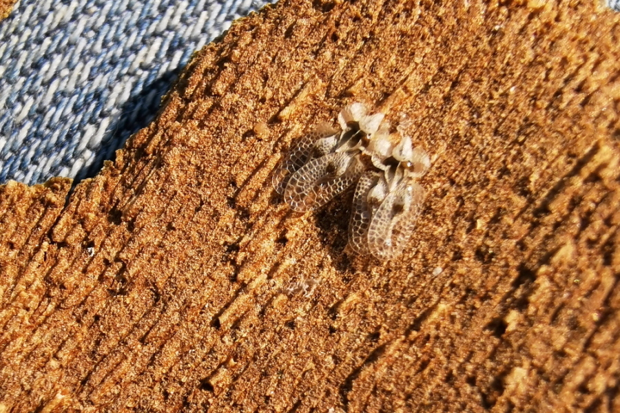 Hier unter der Borkenschuppe einer Platane haben 2 Platanen-Gitterwanzen (Corythucha ciliata) überwintert.