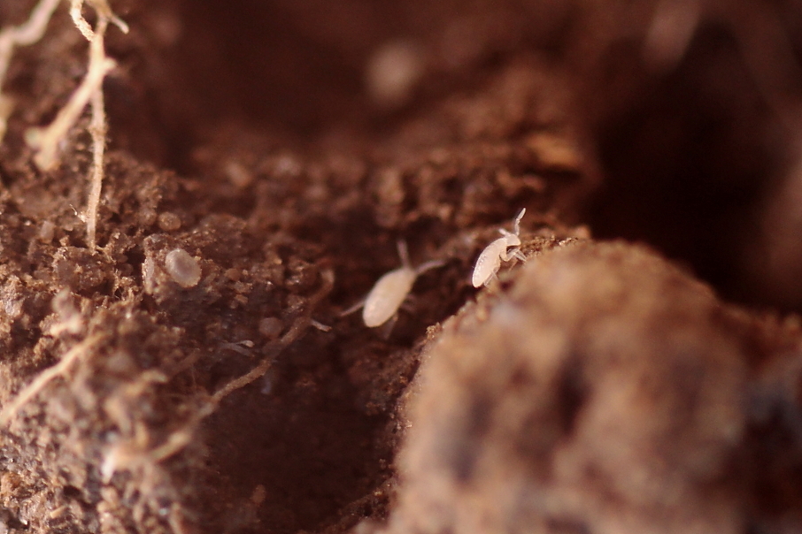 Wikipedia zu Collembola: Überwiegend oder ausschließlich im Boden lebende (euedaphische) Arten sind als Anpassung an ihre Lebensweise im Porengefüge des Bodens wenig gefärbt bis völlig weiß, von kompaktem Körperbau, mit kurzen Antennen, teilweise oder völlig reduzierter Sprunggabel und verringerter Augenzahl.
