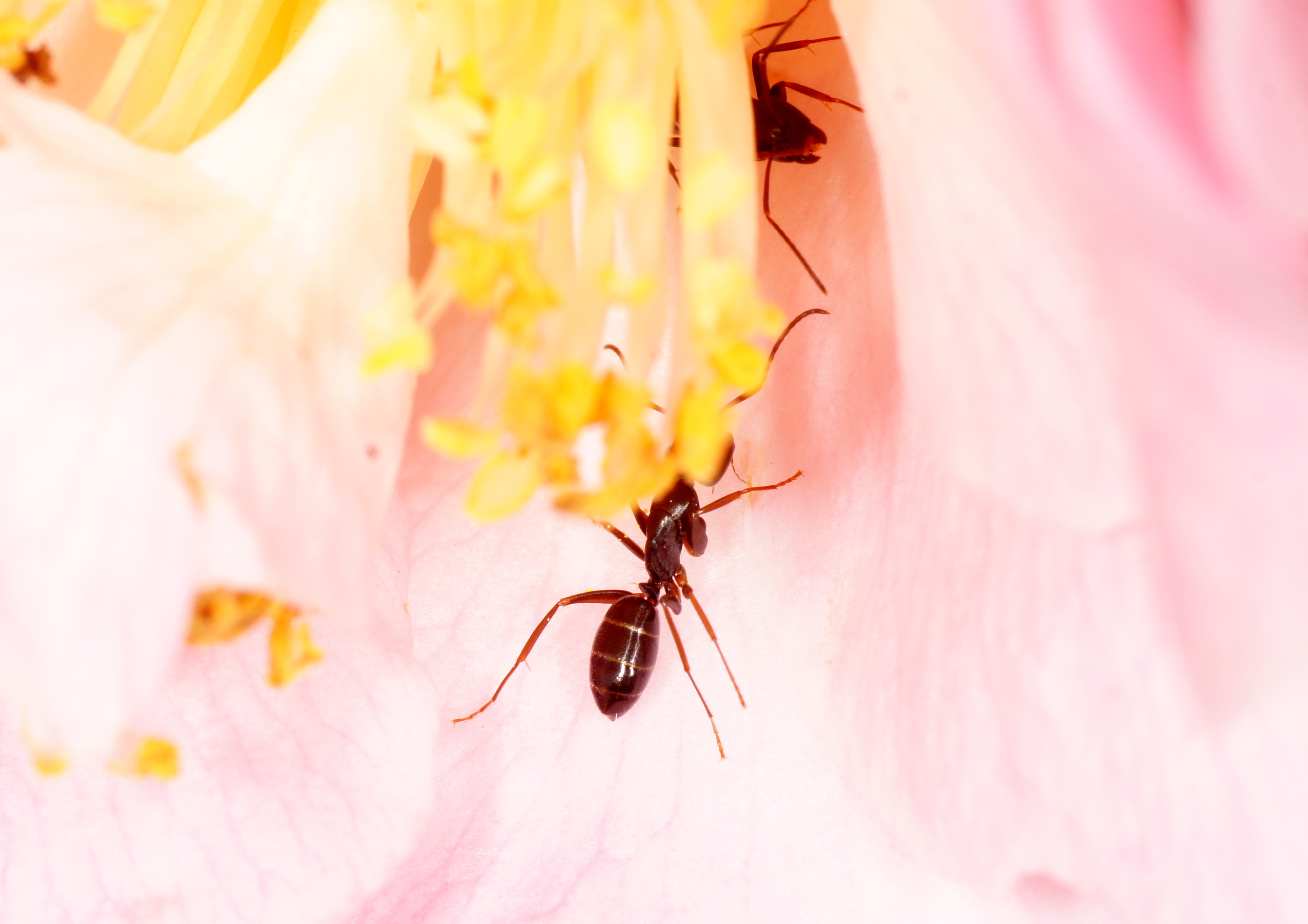 Jetzt muss ich die Auflösung bringen. Ich dachte, es sei kinderleicht. Vor allem die Morphologie des Thorax weist (weist meiner Meinung nach) auf eine Camponotus-Art. Die hellen Streifen am Rand der Tergite sind typisch für C. fallax, eine keinesfalls seltene heimische Art. C. fallax wohnt bei mir (unter anderem) im hölzernen Fensterstock und besucht von dort aus die Camellien- und Rhododendronblüten wegen des Nektars. Eine typisch arborikole Art, ich konnte auch im liegenden Holz (Totholz) noch nie ein Nest entdecken. Seifert schreibt, dass sie vorwiegend nachts furagiert. Bei mir herrscht auch am Vormittag (Ostseite des Hauses!) reger Verkehr. Interessant: Über den Winter übersiedelt sie zur Gänze auf meine Zeder, eine der größten in der Stadt.