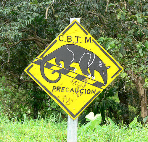 Ein bisschen "verunglückt" sieht es ja bereits auf dem Schild aus, das Tier, das einem da in Costa Rica vors Auto laufen kann. :roll: Was könnte das wohl sein, mit Oberlippenbärtchen, Mäuseohren und Affenschwanz? Auf einem Zebrastreifen habe ich es auch nie gesehen. ;)