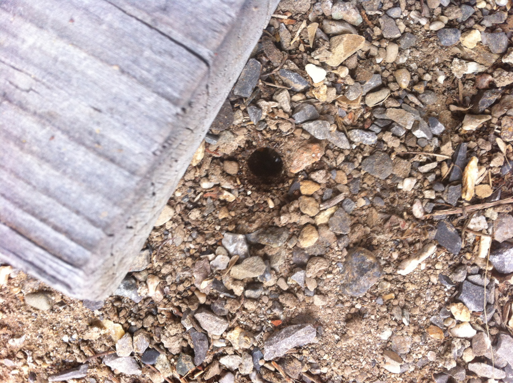 Dann löse ich mal auf: Es handelt sich um einen Brutstollen einer Sand- bze. Erdbiene, die ich leider nicht bestimmen konnte, da sich die Tiere immer nur kurz und nie ganz an der Oberfläche zeigten. Stören oder ausgraben wollte ich nicht.