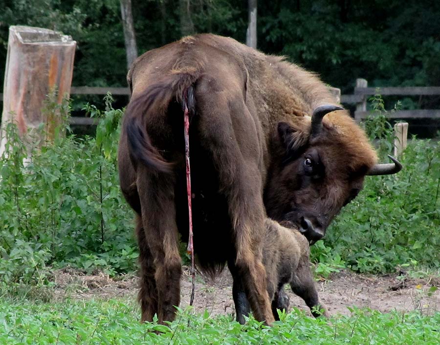 Das Bild zeigt eine Wisent-Kuh, die ganz kurz zuvor ein Kalb geboren hat. Es stakste noch recht unbeholfen umher, fand aber doch zielsicher zum Euter der sichtlich stolzen Mama. ;)