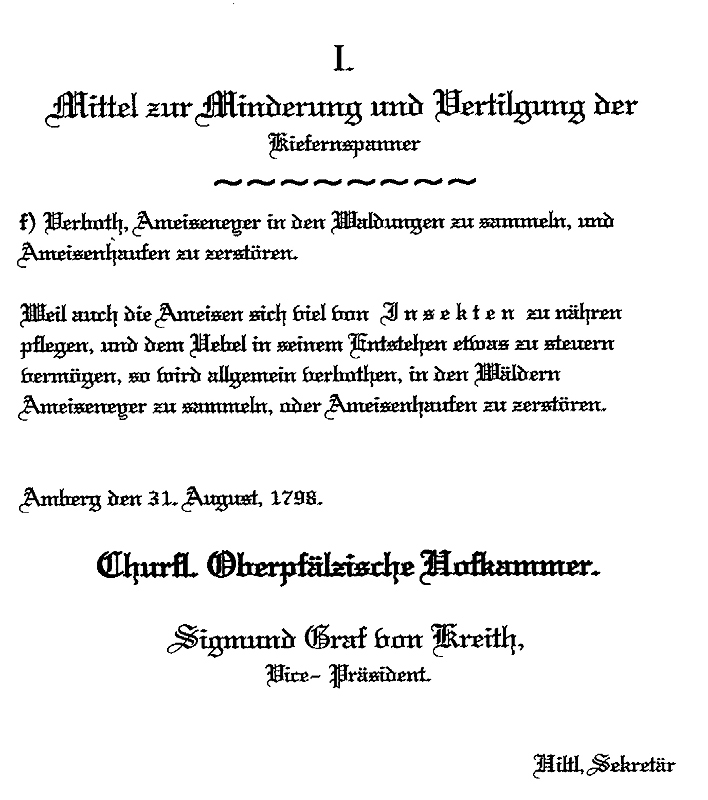 Merkur hat geschrieben:Waldameisenschutz seit 1798Anlässlich einer Anfrage an die DASW habe ich dieses Dokument erhalten, das ich hier einbringen möchte. Gefragt war nach der Quelle für die Angabe unter „Wussten Sie schon, dass: ... Waldameisen seit über 200 Jahren unter Naturschutz stehen?“ auf dieser Seite (ganz unten).