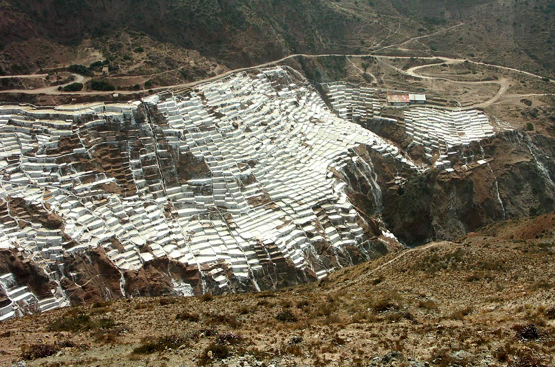 so dass man alles aus der Nähe inspizieren kann. Die Pisten oberhalb der Salzterrassen dienen dem Abtransport des Salzes, das In den Gebäuden rechts oben in Säcke abgefüllt wird.