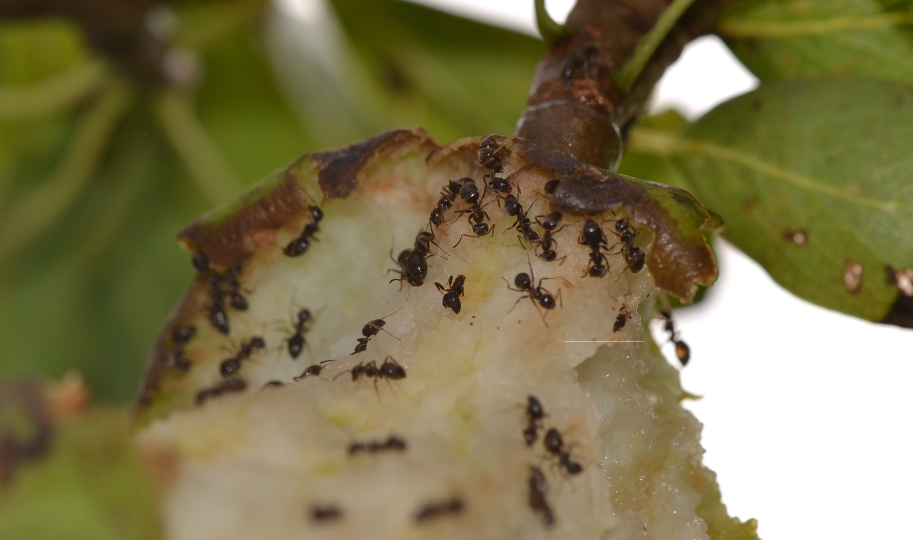die Birne wurde von einem Gartenschläfer (Eliomys quercinus), engl. "Garden Dormouse", angefressen. Steffen war auch schon mit dem Baumschläfer ganz nah dran, beide gehören zur Familie der Bilche. Die Tiere sind nachaktiv und äußerst schwierig zu fotografieren. Bei geschicktem Anpirschen und vorsichtigem Anleuchten sind Sie trotzdem ganz gut zu beobachten. Gartenschläfer können meiner Beobachtung nach hervorragend und vor allem fast lautlos klettern. Bei der Wahl der Nahrung sind sie aus eigener Erfahrung und im Gegensatz zu machen Quellen, sehr wählerisch: Von mehren Sorten Äpfel, Birnen, Trauben werden nur ganz bestimmte bevorzugt, der Rest wird nicht angerührt. Laut Wikipedia fressen die Tiere aber auch Insekten und Schnecken.