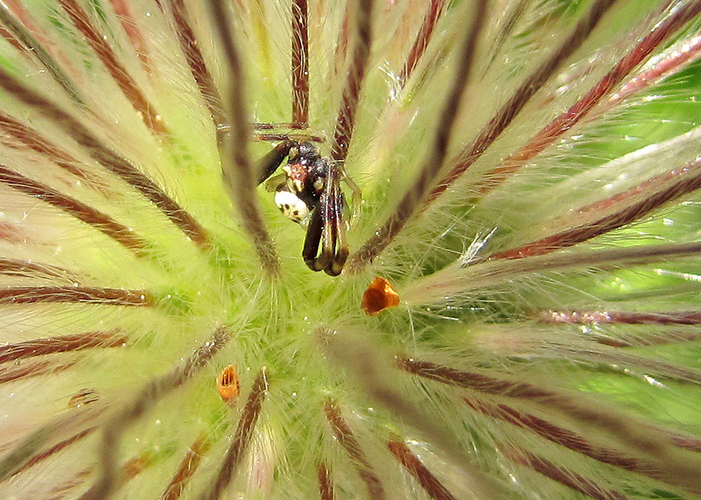 Er lauert im Fruchtstand der Küchenschelle (Pulsatilla vulgaris), die ich kürzlich hier vorgestellt hatte.