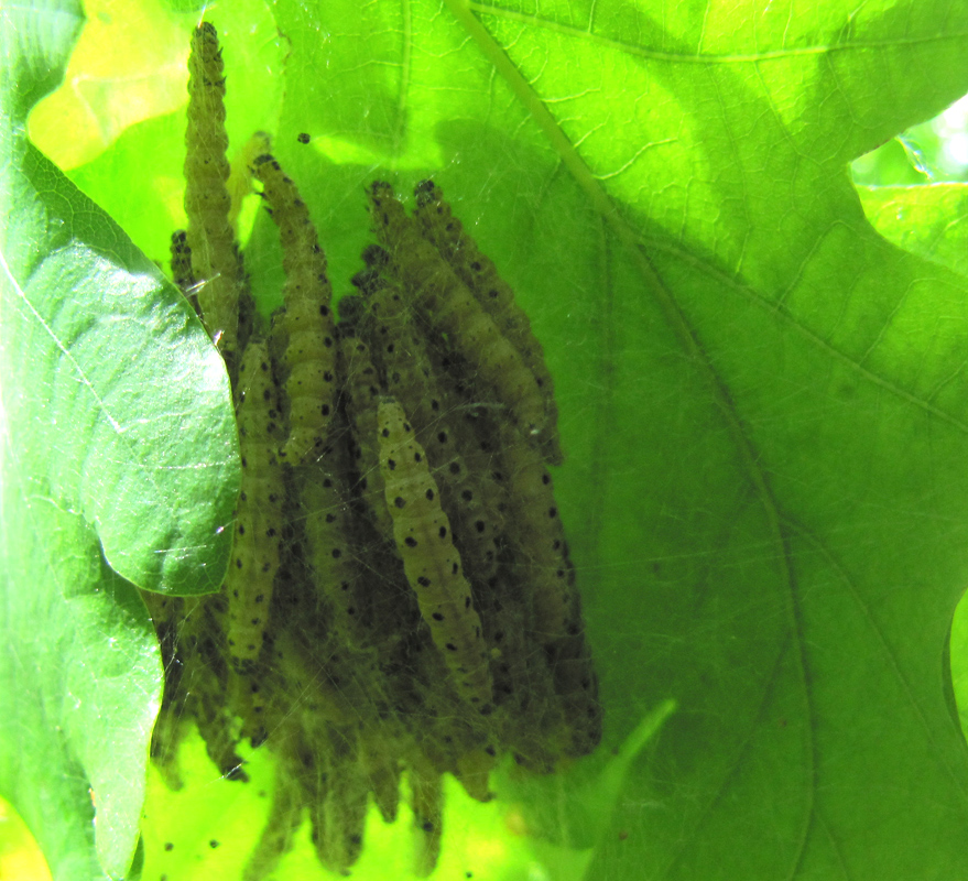 Gespinsten verpuppen sie sich auch. Auf dem Bild hat sich die Gruppe von Raupen hinter einem Eichenblatt vor der Sonneneinstrahlung