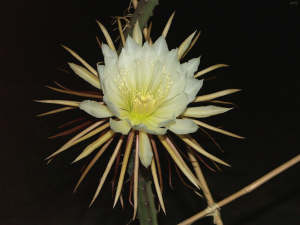 Endlich habe ich etwas herausbekommen über die Bestäubung meines Selenicereus grandifloris, der "Königin der Nacht". Jedes Jahr erfreut sie mit wunderschönen, riesigen Blüten. Aber wer bestäubt diese? Es sollte ja ein Tier aus ihrer mittelamerikanischen Heimat sein. In der letzten Nacht habe ich es endlich herausgefunden. Aber seht selbst:Eine der prachtvollen Blüten, die sich abends öffnen, und bis zum Morgen welk herunter hängen.