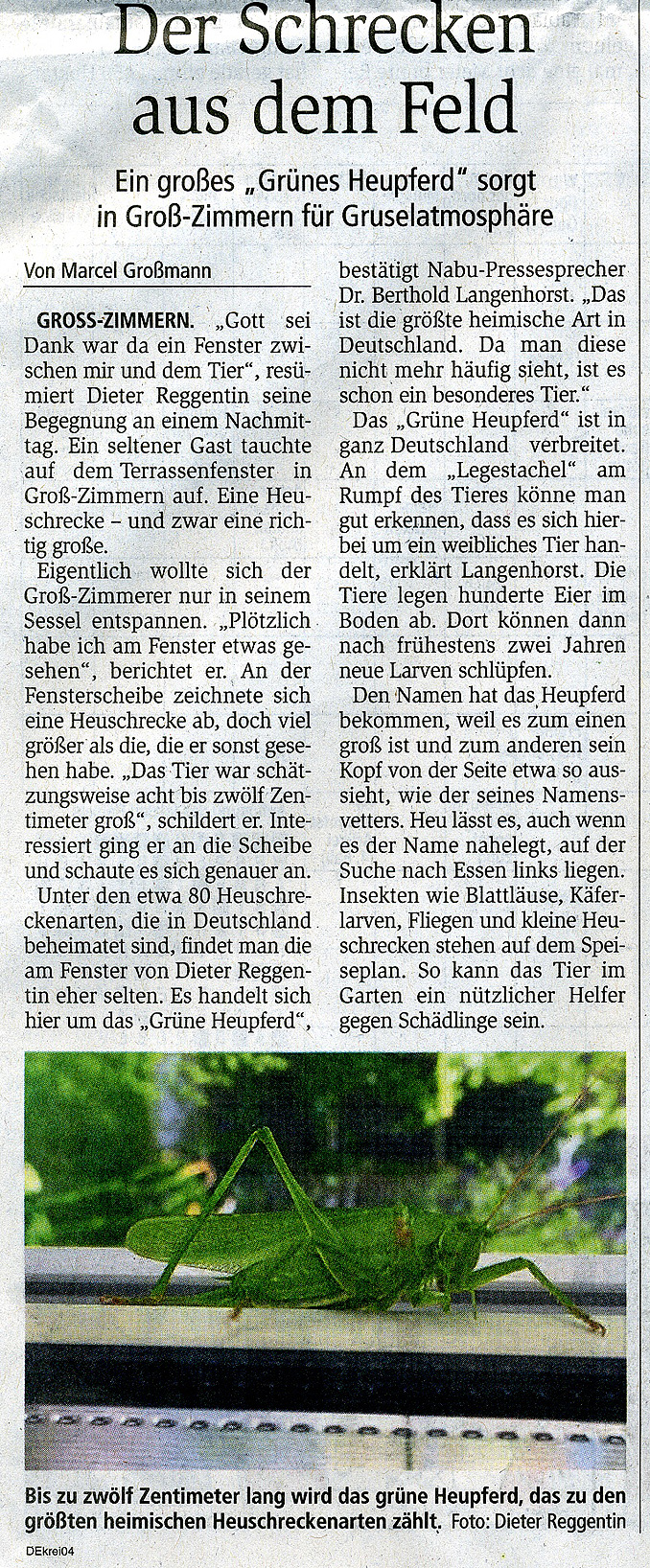 Sind wir jetzt schon so weit, dass die Sichtung einers Großen Grünen Heupferds (Tettigonia viridissima) einen Beitrag in der Tageszeitung (Darmstädter Echo, 22.07.2019) wert ist?