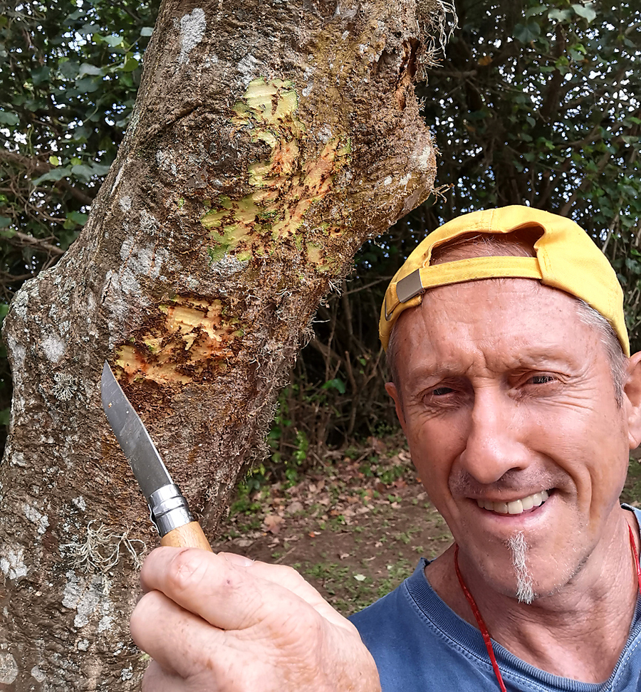 In diesem Bild zeigt er sich im August 2019 beim Sammeln von Melissotarsus aus deren Gängen in der Borke eines Baumes in Südafrika.