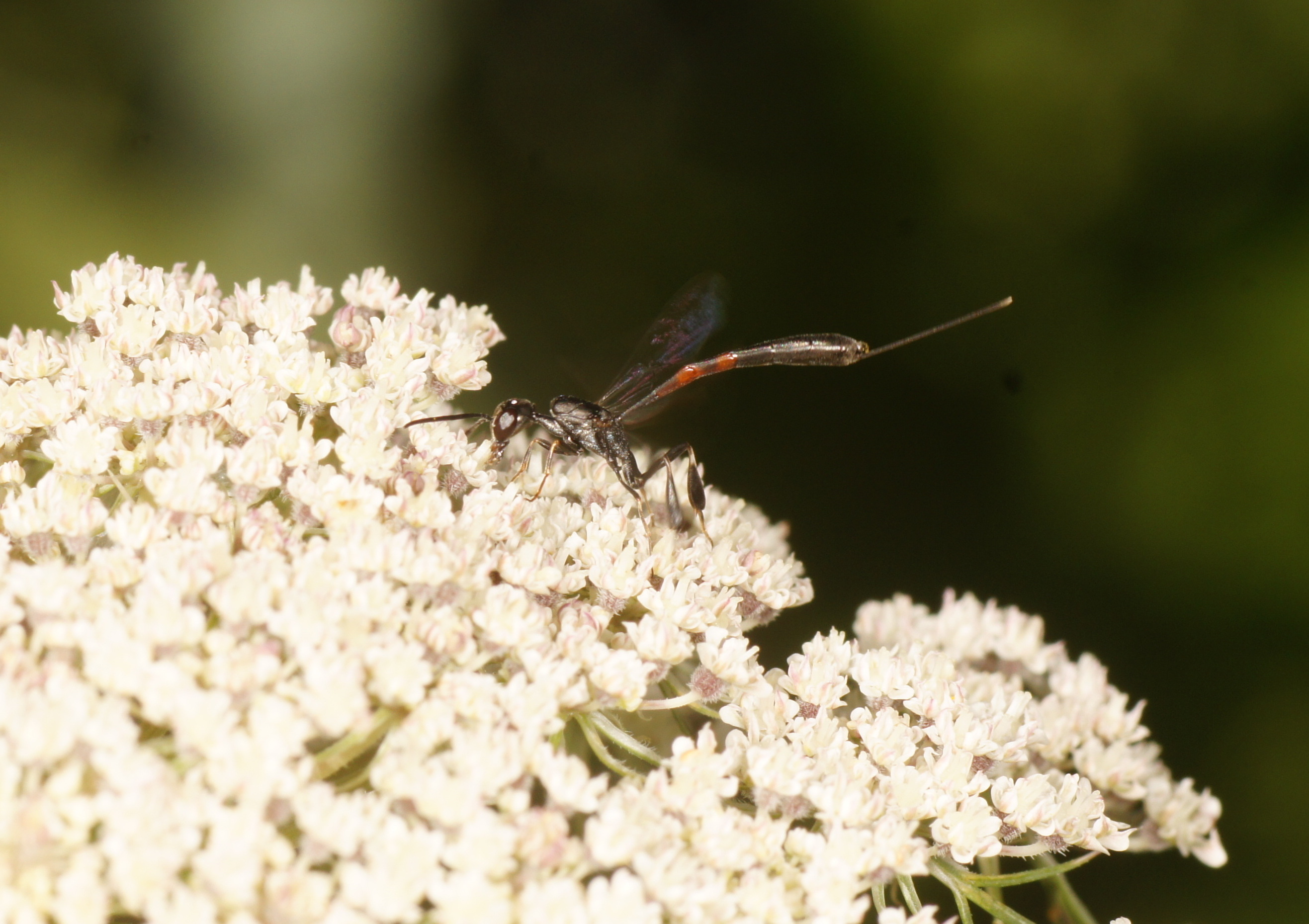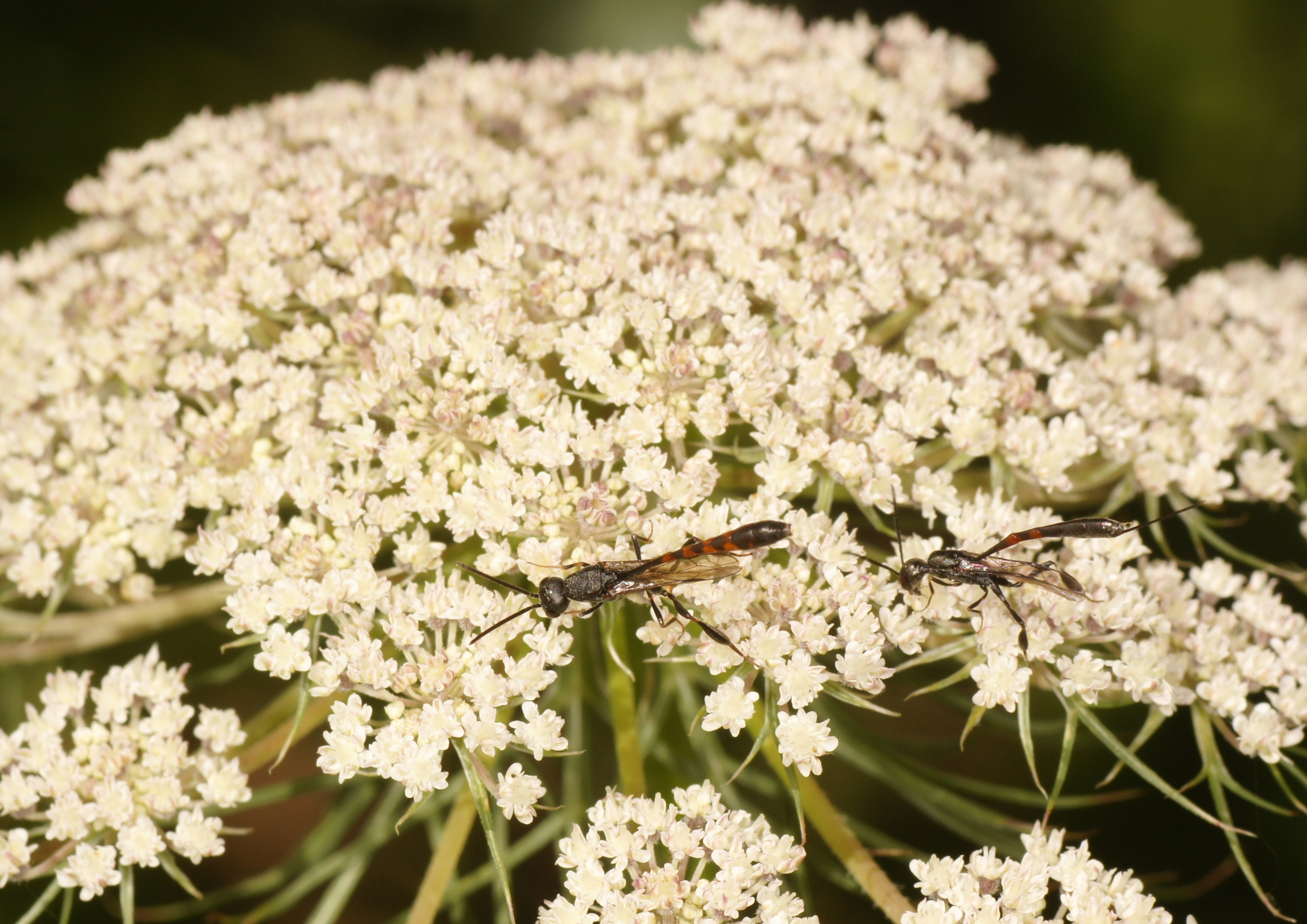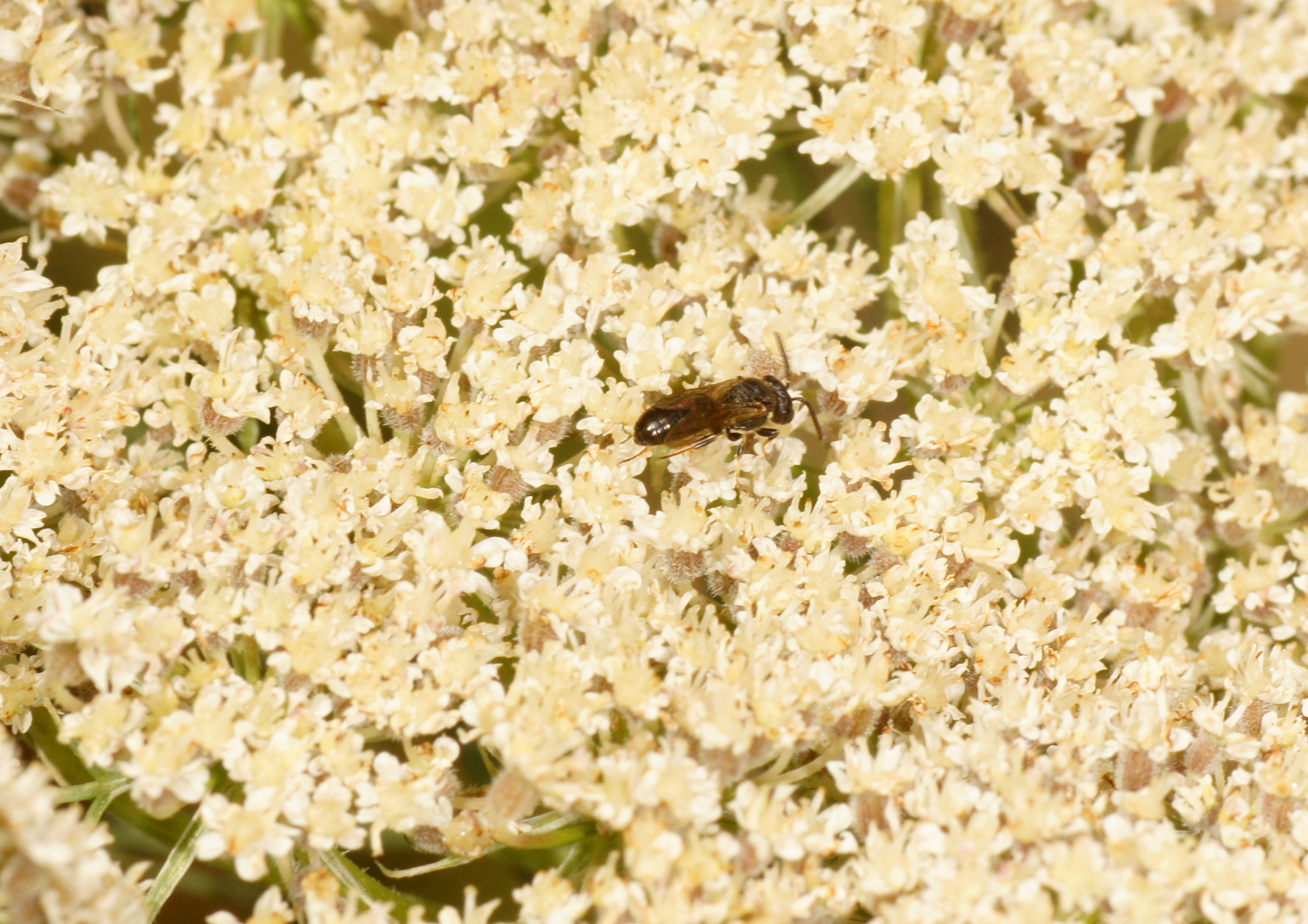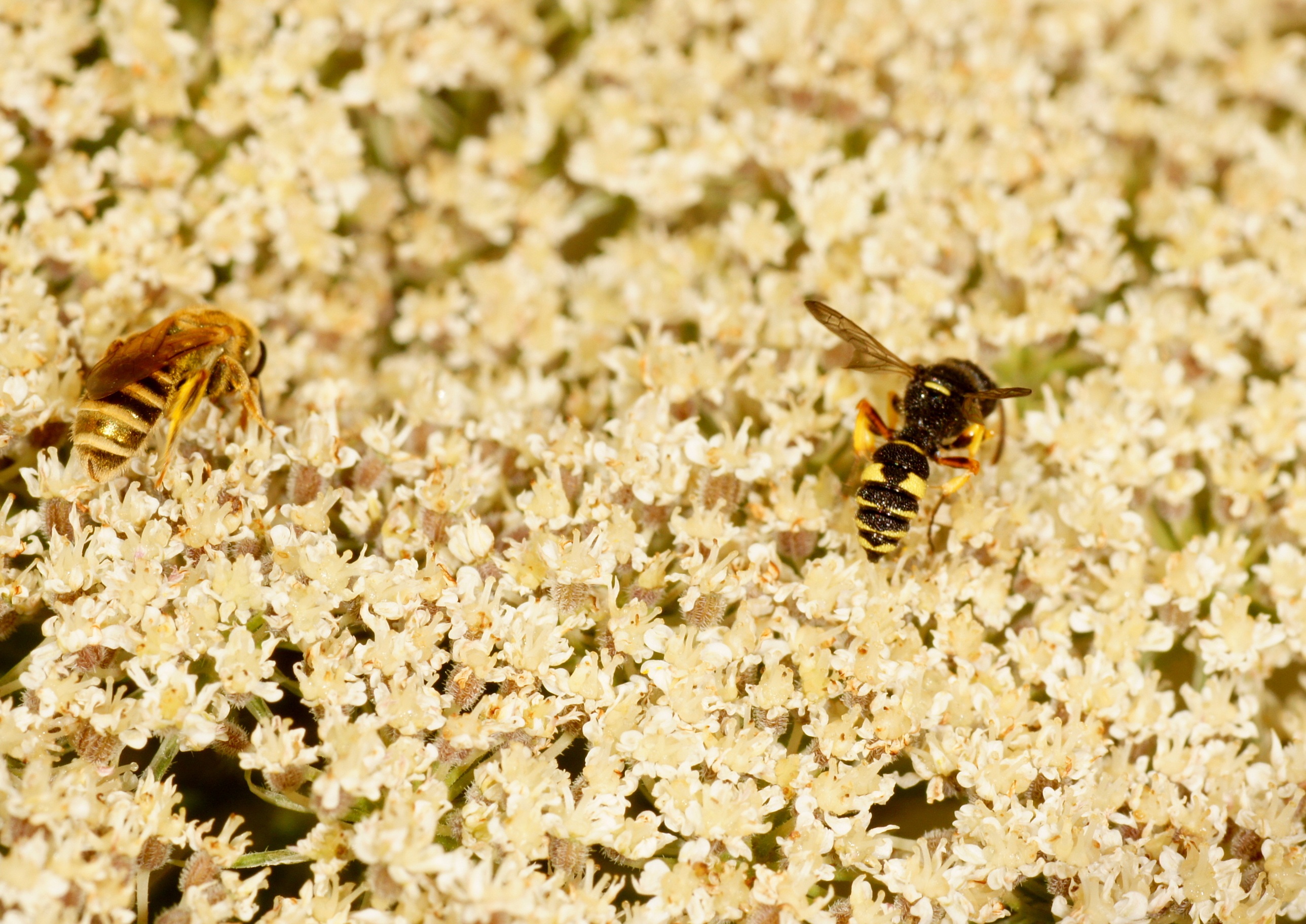 Im Hochbeet hatte ich im vorigen Jahr eine Karottenpflanze vergessen (Daucus carota). Heuer hat sie ausgetrieben und besitzt 3 Blütendolden. Welche Besucher sich da wohl einfinden?