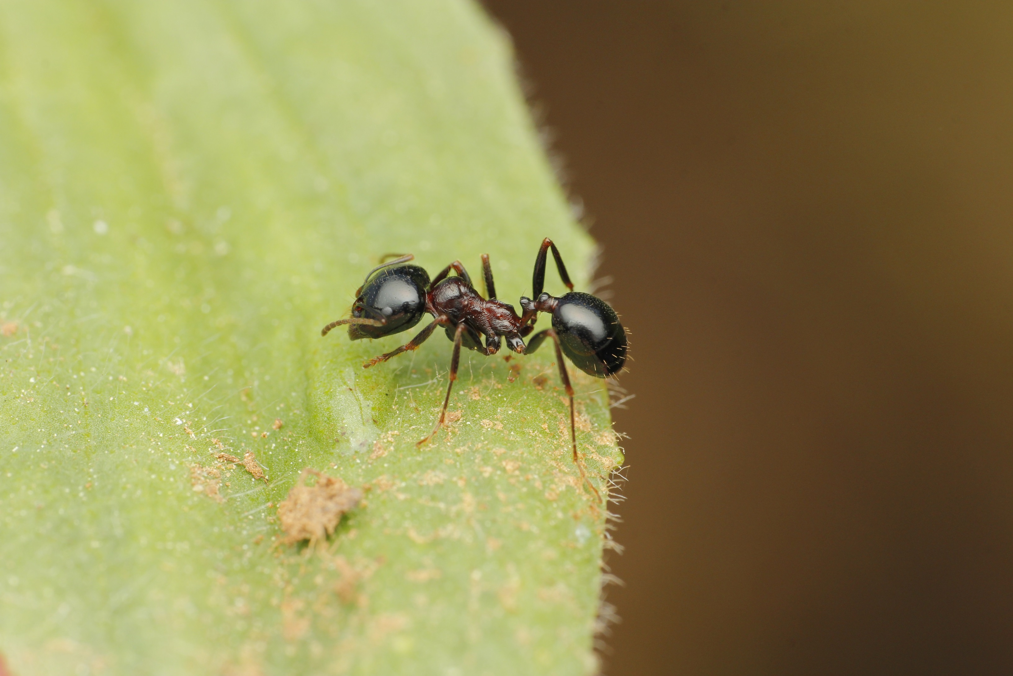 Camponotus aethiops, am unteren Rand ein Individuum im Kampf mit einer kleinen Ameise, vermutlich eine Arbeiterin von Pheidole.