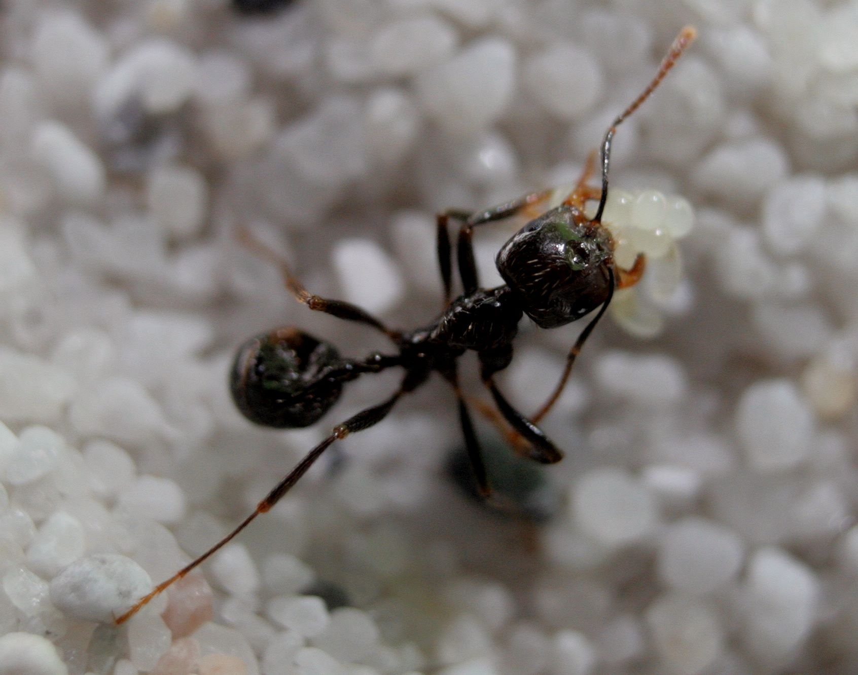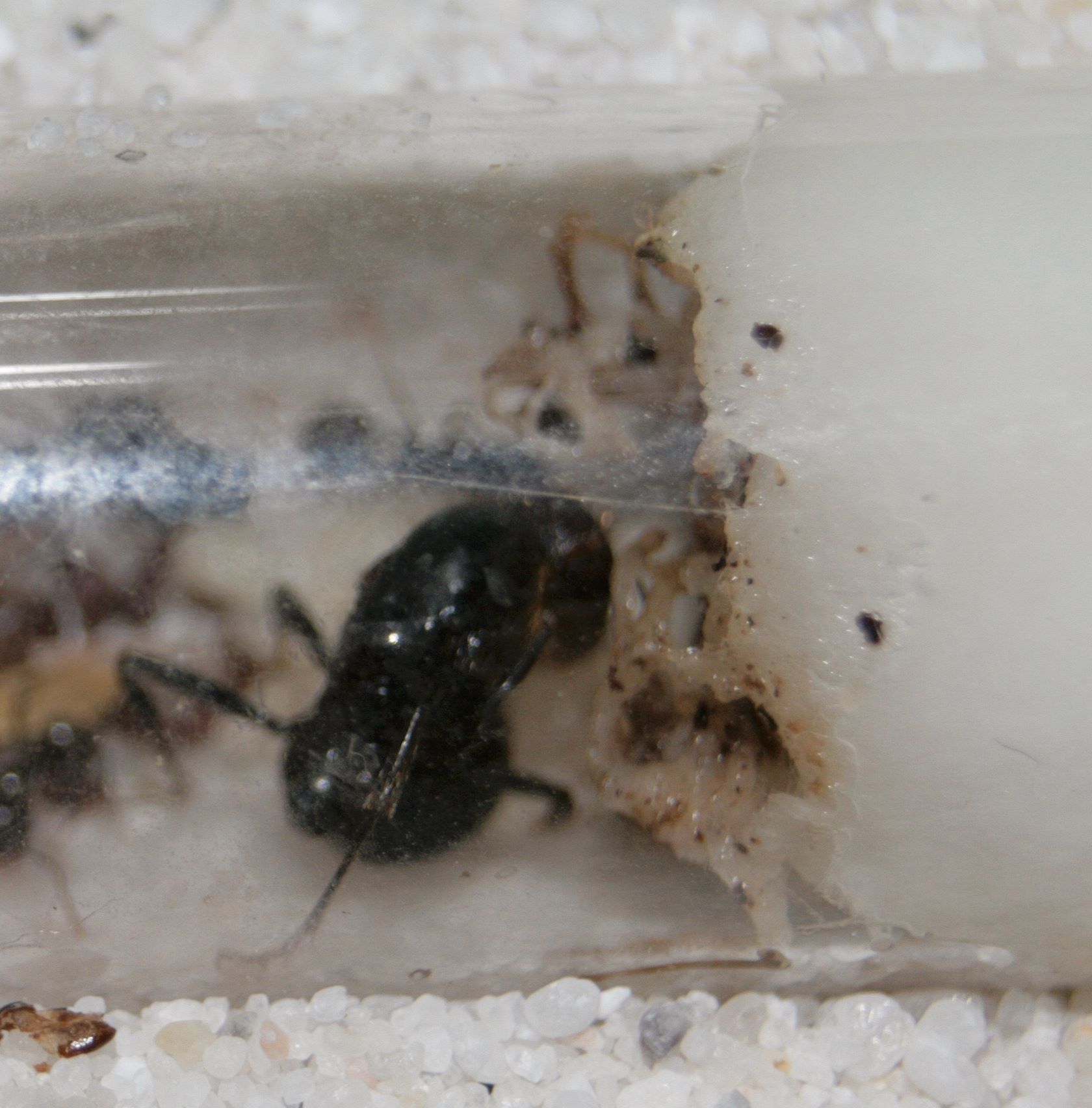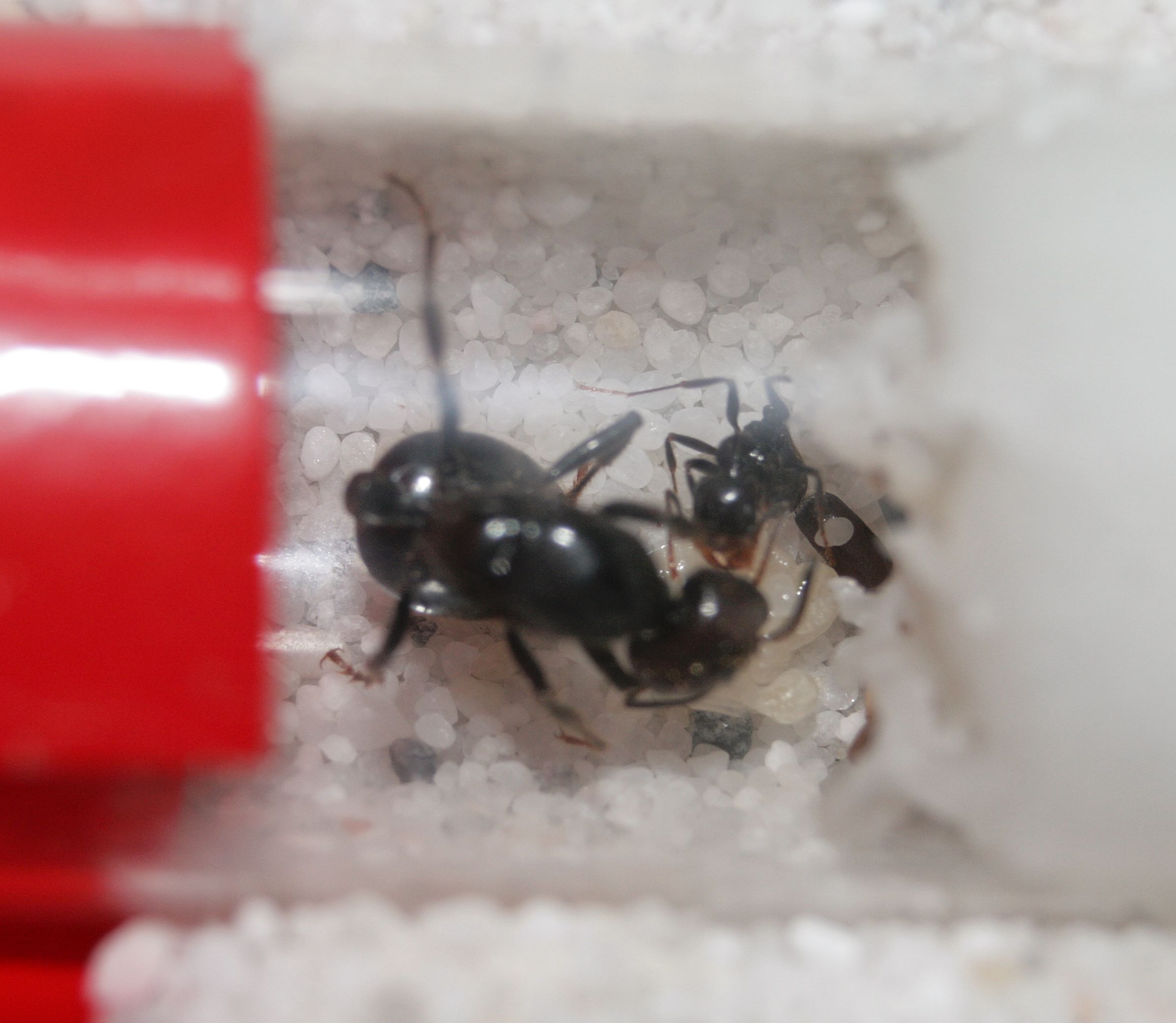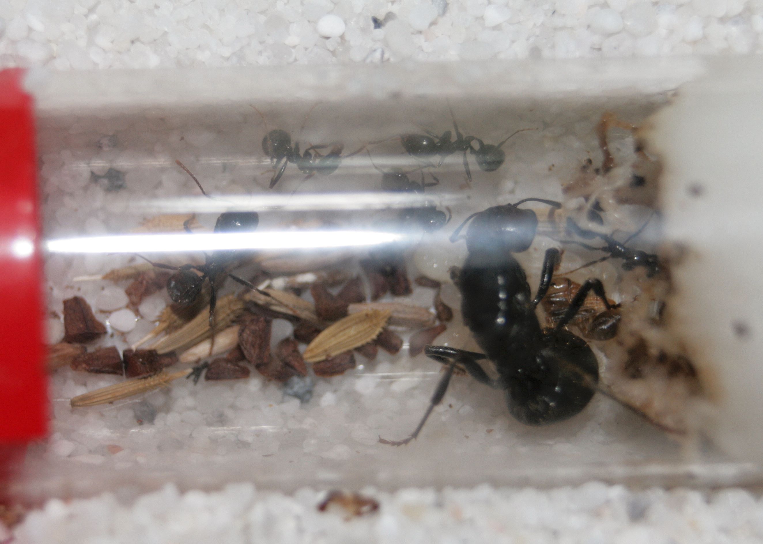 Inzwischen tauchen auch bereits größere Arbeiterinnen auf. Ich würde sagen, erkennbar größer als Myrmica-Arbeiterinnen. Ich bin wirklich schon auf die ersten Majore gespannt. Muss ich wohl mehr eiweißreiche Kost liefern?