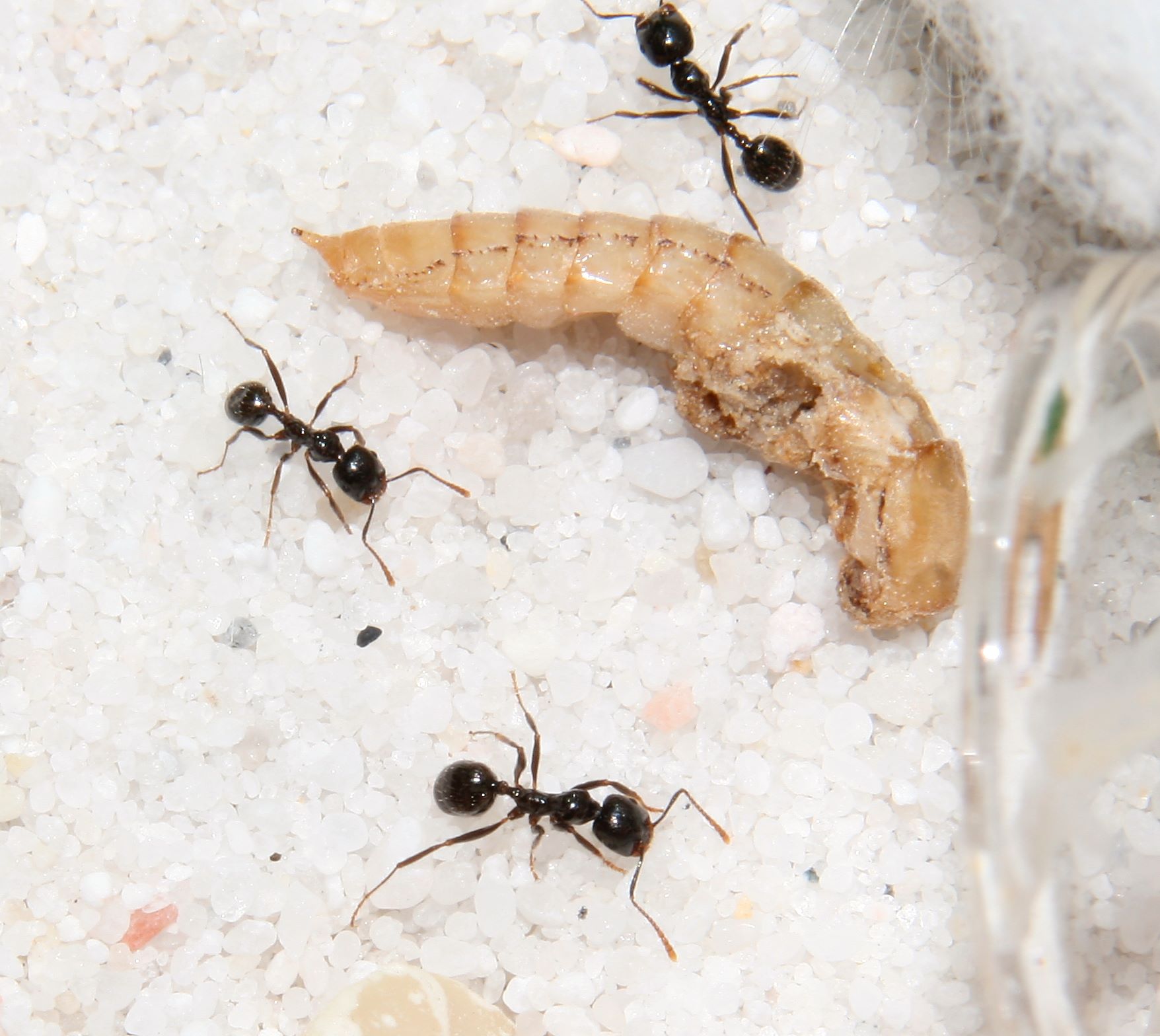 Eigenartigerweise nehmen sie gar nicht so sehr eiweißreiche Kost an. Fliegen lassen sie ganz liegen, Mehlpuppen auch. Mehlwürmer haben sie mal ein paar Stücke eingetragen.