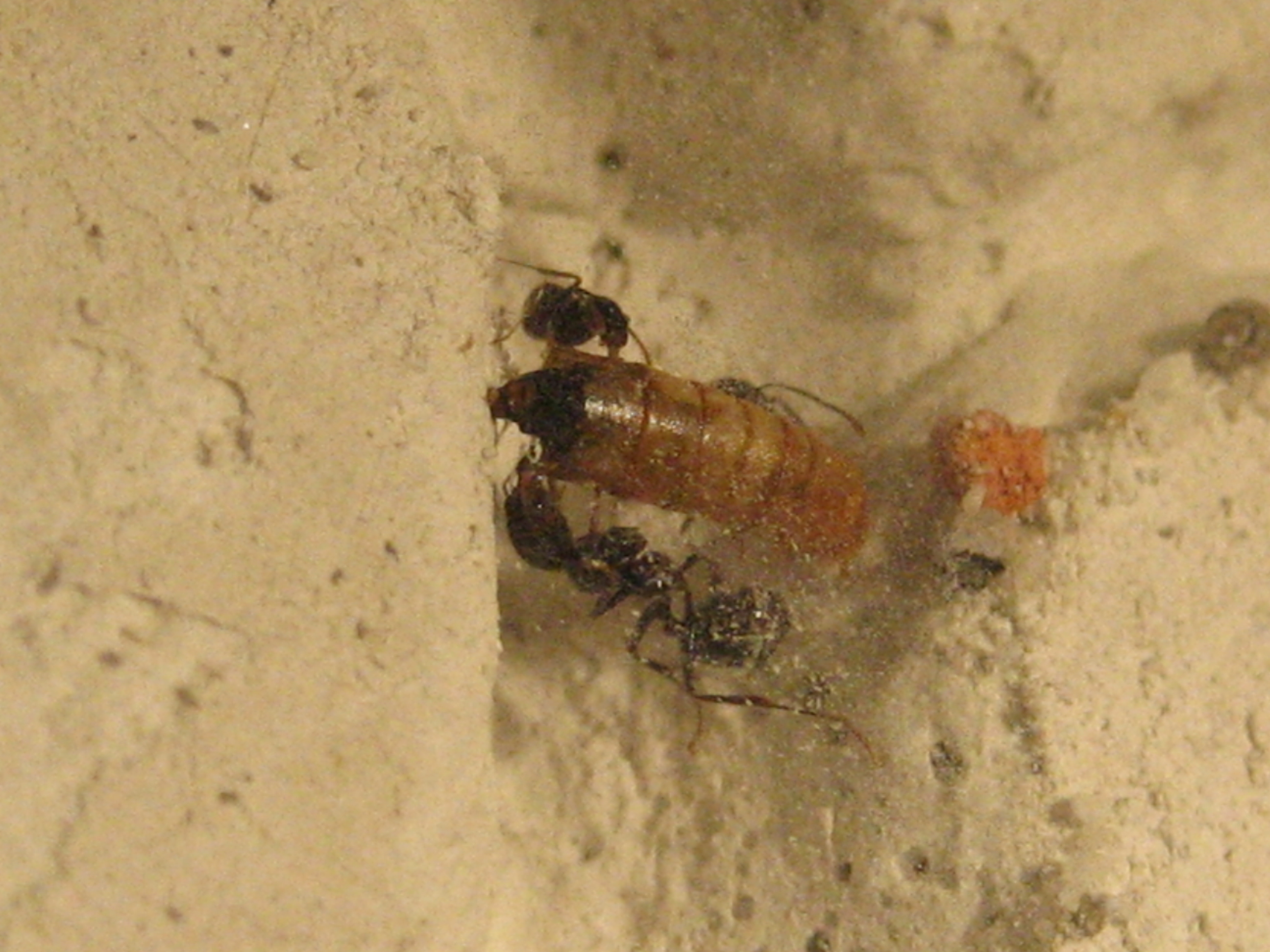 Gestern lief mir tatsächlich eine bereits recht beachtliche Media über den Weg. Inzwischen bewohnt die Kolonie drei RG. Das ursprüngliche, bereits eher trockene als Kornkammer, ein weiteres als Aufenthaltsort für Arbeiterinnen, Larven und Puppen und im dritten ist nun die Gyne eingezogen.