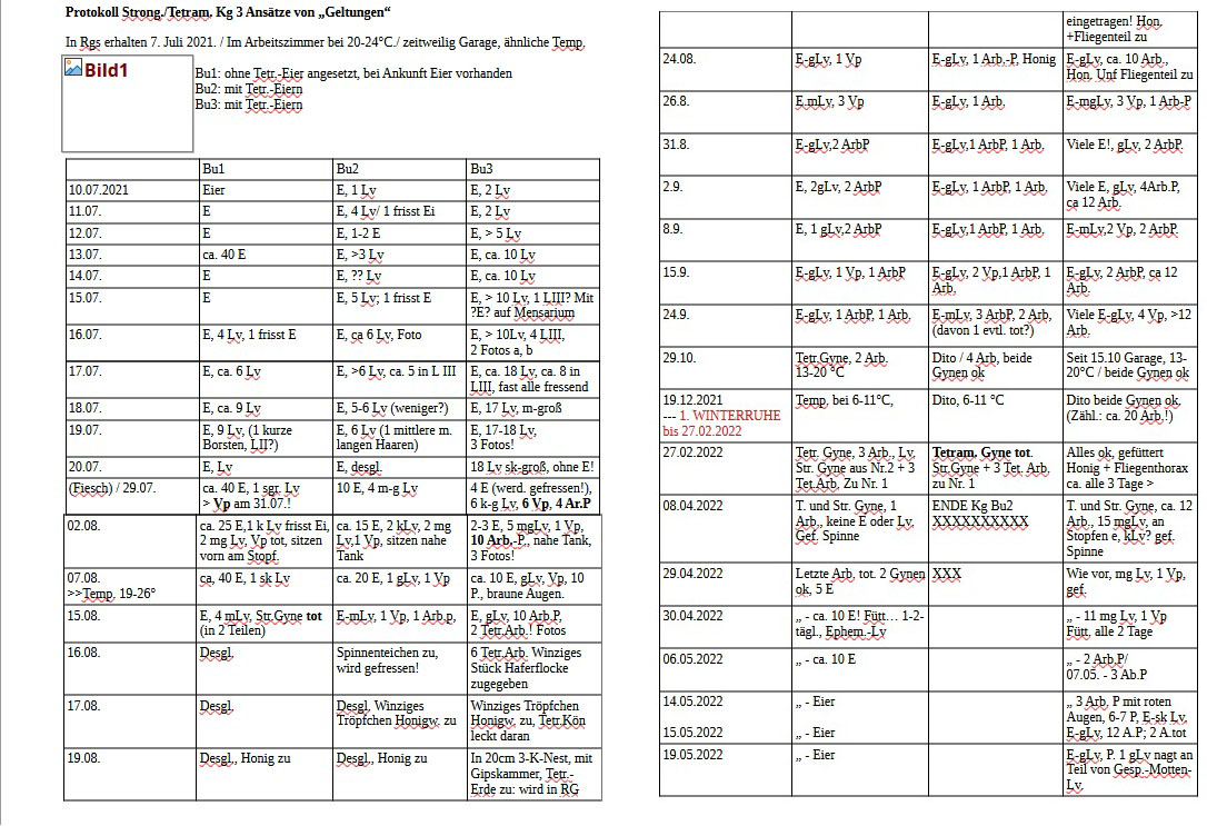Es entstanden keine Str.-Arbeiterinnen, obwohl die letzte Kolonie zweimal überwintert wurde. Zuletzt traten Milben auf (in den Foren wären sie als „harmlose Futtermilben“ identifiziert worden!). Offenbar haben sie die reichlich neu gelegten Eier gefressen.