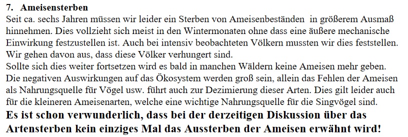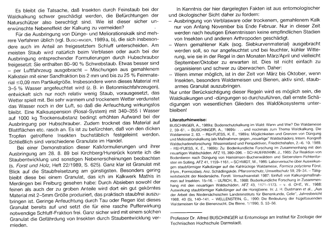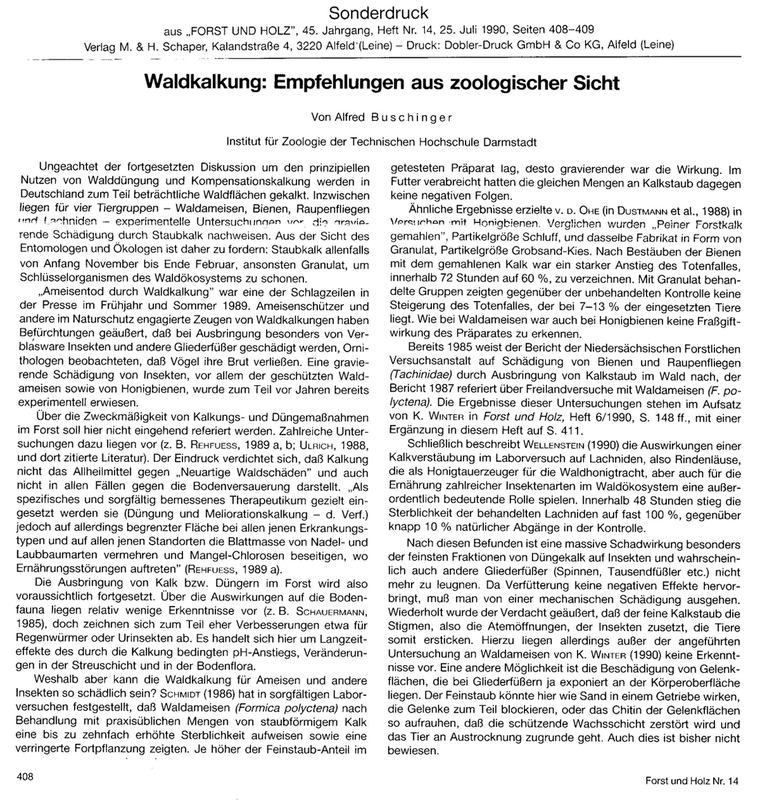 „Die Laborversuche mit Ameisen, Bienen und Raupenfliegen führen nach Behandlung mit Kalkstaub in allen Fällen zu teilweise drastischen Beeinträchtigungen, z.B. zu hoher Mortalität, geringer Fruchtbarkeit und geringerem Beuteeintrag. Dabei werden besonders die Antennen und Mundwerkzeuge mit Staubpartikeln überzogen, während die Stigmen frei bleiben.....Die im Labor beobachteten Schäden durch Staub treten bei Ameisen auch im Freilandversuch auf, sind hier jedoch deutlich geringer.....Bereits der heutige Kenntnisstand über die Nebenwirkungen der Kalkung mit Staubdüngern verbietet die Ausbringung während der Vegetationszeit. Zwischen dem 28. Februar und dem 15. November sollte nur Granulat oder feuchtes Material ausgebracht werden.“