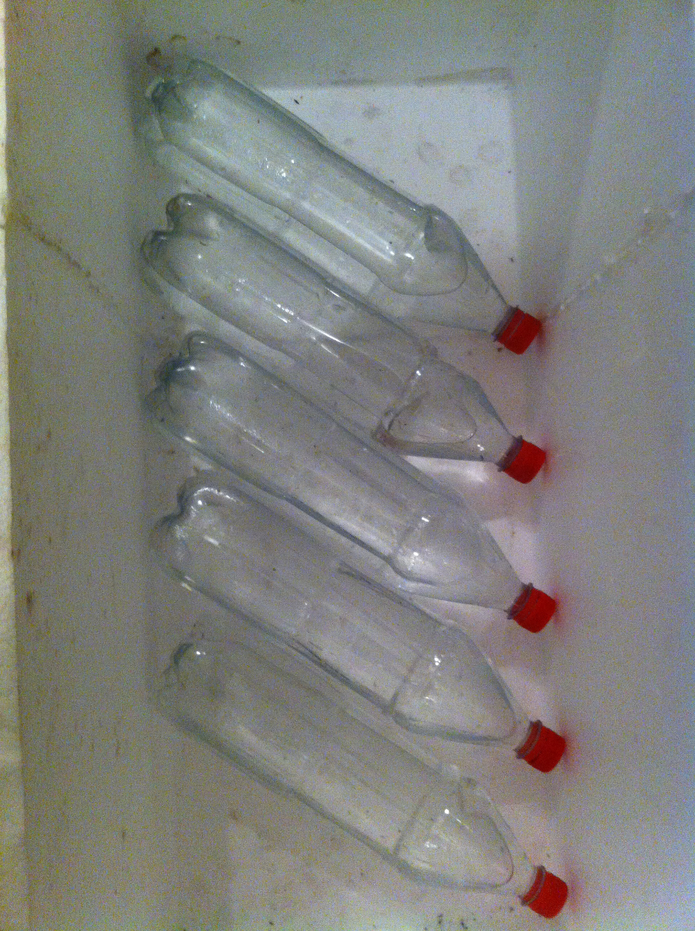 Die PET-Flaschen dienen als „Wärmespeicher“. Sie werden zu 2/3 mit Wasser gefüllt, dass die Temperatur länger speichert, als die Luft. Das verzögert Temperaturschwankungen zusätzlich.