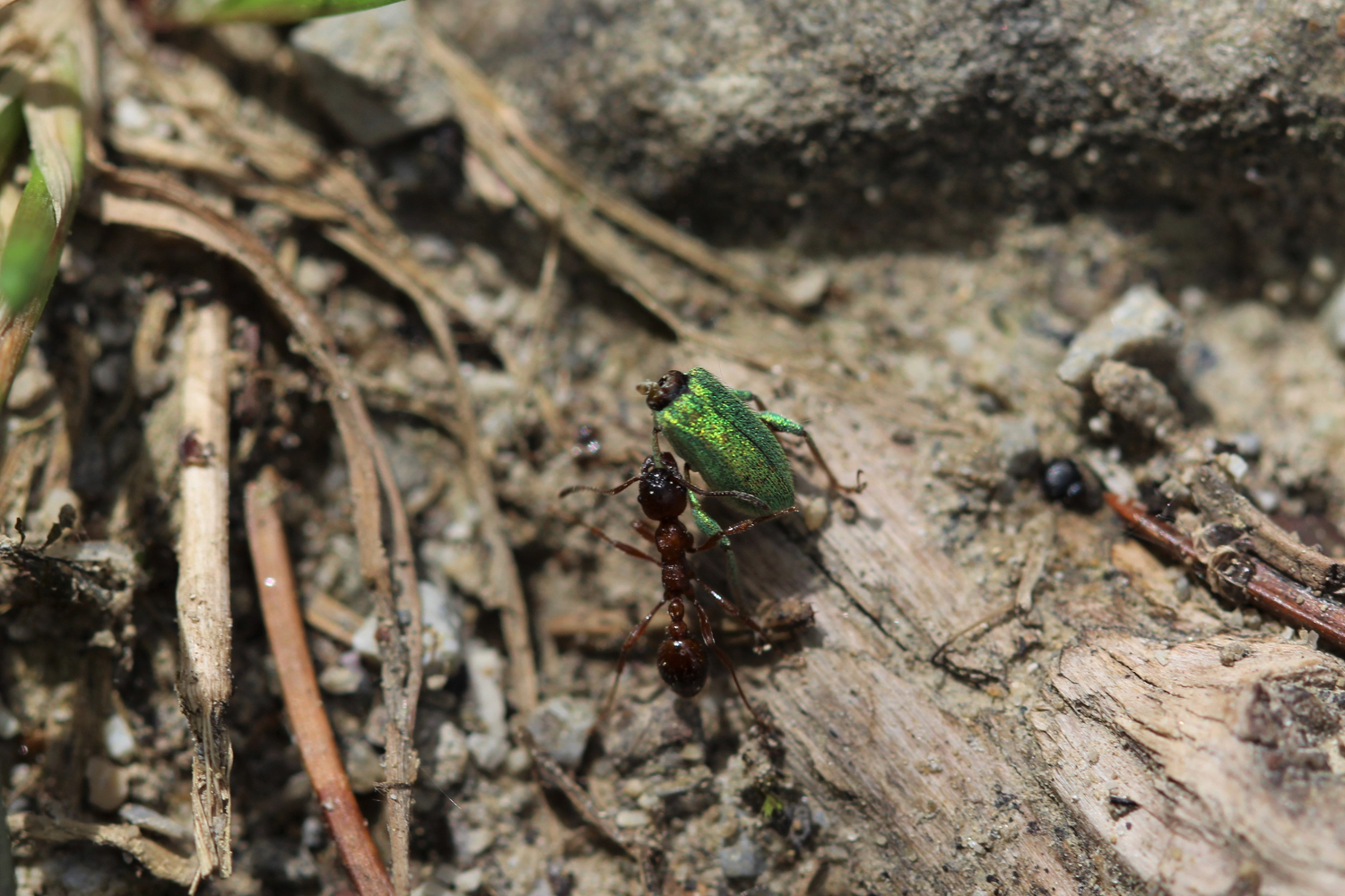 Manica bringt dort Jahr für Jahr grosse Arbeiterinnen und Geschlechtstiere hervor. Unbehelligt bewegen können sich die Tiere allerdings nur im Bereich ihrer Nesteingänge. Kaum 50 cm weg vom Eingangsbereich sind starke, gemeinschaftlich agierende F. fuscocinerea-Verbände unterwegs, die die einzelnen Manica attackieren und augenscheinlich alle Insekten-Nahrung abtransportieren bzw. Blattlauskolonien besetzen. Man sieht die roten Riesen zwar fouragieren, aber nichts eintragen.