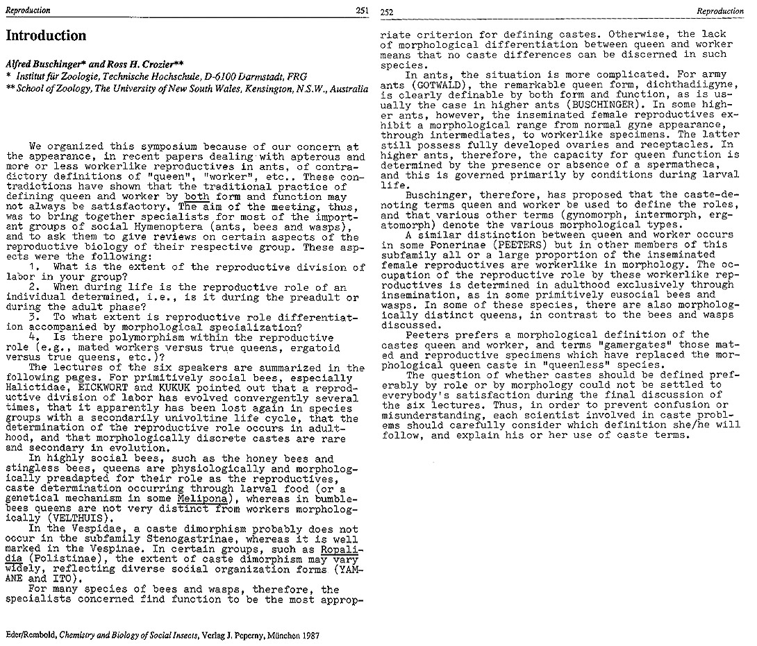 Buschinger, A., Crozier, R.H.:Towards a unified reproductive Biology of the Hymenoptera. In: Eder/Rembold, Chemistry and Biology of Social Insects.