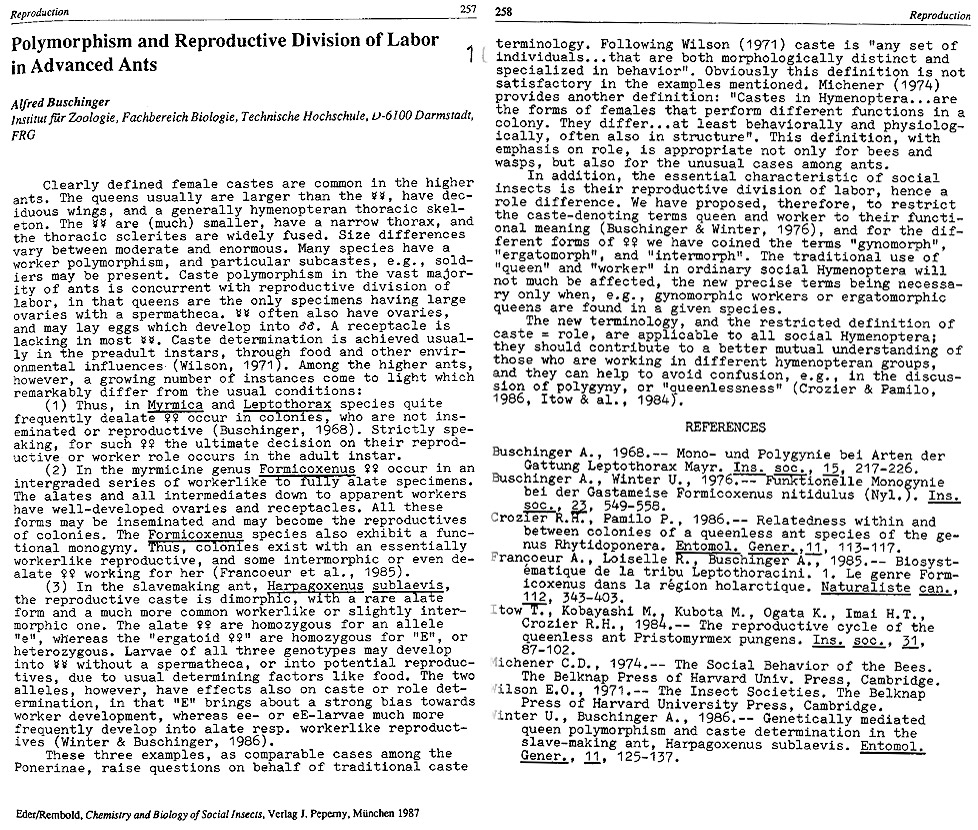 PEETERS, C. & CROZIER, R.H. 1988: Caste and reproduction in ants: not all mated egg-layers are “queens”. Psyche 95, 283-288