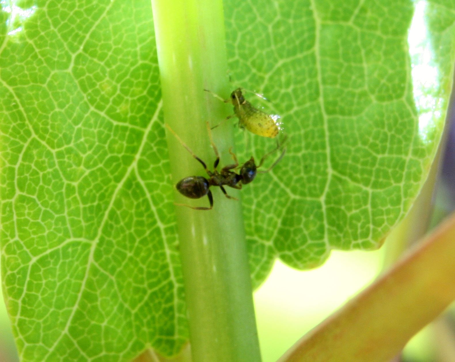 Viele Ameisenarten besuchen Blatt-, Rinden- oder Wurzelläuse um deren zuckerhaltigen Kot (Honigtau) aufzunehmen. Manche Arten betreuen ihre Blattlausherden sogar recht intensiv. Eine solche Symbiose im Formikarium nachzubilden ist allerdings nicht einfach.