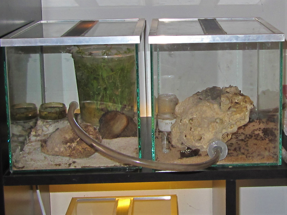 Behälter mit Erbsenblattläusen im linken Formicarium.