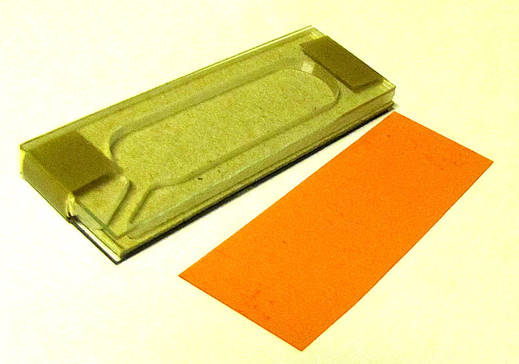 Die Verklebung der “sandwich“-Konstruktion mittels transparenter Klebstreifen sollte nicht Teile der Kammern verdecken: Es wird bei Feuchtigkeit milchig-trüb, undurchsichtig. Deshalb haben wir es an den Schmalseiten der Objektträger nur über Bereiche geklebt, wo es ohnehin nur das Rähmchen verdecken konnte. Da reicht dann auch braunes Paketklebeband, das etwas haltbarer ist als das transparente Material. Der Eingang war schräg angelegt u. a. um die Verklebung so anbringen zu können, wie im Bild gezeigt.