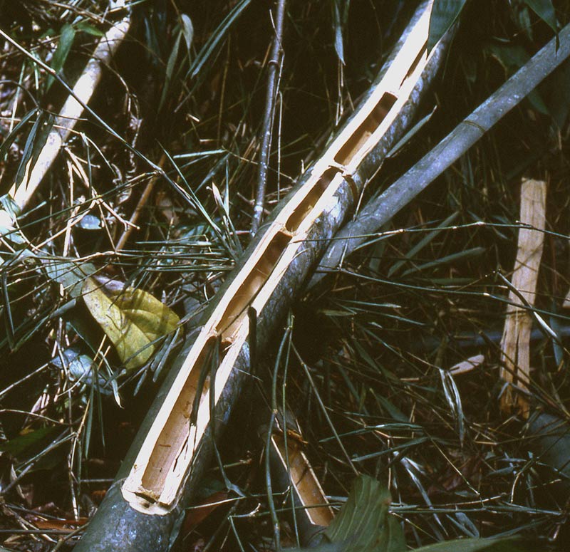 Für die Ameisen zugänglich werden die Internodien nur durch die Tätigkeit einer Schmetterlingsraupe, die zunächst in den Hohlräumen lebt und vor der Verpuppung einen Ausgang passender Größe nagt (oval, ca. 2 x 3 mm klein). Eine Ameisenkolonie kann mehrere Halme in einem Bambusbüschel besiedeln, jedoch immer nur die über diese Öffnungen zugänglichen Internodien; die Querwände können sie nicht durchnagen. Der Verkehr zwischen den Nestteilen erfolgt über die Halmoberfläche und über Blattbrücken zwischen den Halmen.