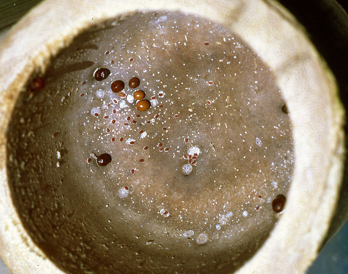 Eine Kolonie haben wir komplett ausgezählt. Sie besiedelte 36 Internodien in 9 benachbarten Halmen und enthielt 1 Königin, 6.953 Arbeiterinnen, 2.079 Geflügelte (Männchen und Weibchen inklusive Puppen) sowie zahllose Eier und Larven. Weiterhin leben in den Bambushalmen, gehäuft nahe den Nodien oben und unten, sehr viele auffällige Schildläuse. Bild 3 zeigt einen Blick in ein aufgesägtes Internodium (Innendurchmesser ca. 10 cm), an dessen Grund, auf der Querwand des Nodiums, größere und kleine Schildläuse erkennbar sind.