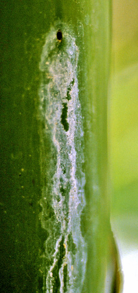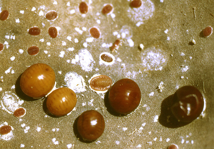 Die Schildläuse (genauer: Pseudococcidae, Schmierläuse oder Wollläuse) mit dem Namen Kermicus wroughtoni saugen Pflanzensaft wie alle Blattlaus-Verwandten und geben den überschüssigen Honigtau ab, Nahrung für die Ameisen! Die Läuse sind im Larvenstadium beweglich, setzen sich aber bald mittels eines wachsartigen Sekrets fest. Bild 4 zeigt die hell- bis dunkelbraunen adulten Schildläuse, sowie einige jüngere Stadien. Die kleinsten roten Tierchen sind noch beweglich. Zahlreiche Wachsflecken (weiß) zeigen, wo bereits Läuse gesessen hatten. Zum Teil wurden die fehlenden Läuse vermutlich gefressen, oder in andere, neu besiedelte Internodien verfrachtet.