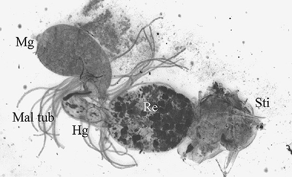 Das Präparat beginnt mit dem Mitteldarm (Mg; der Kropf würde links anschließen), dahinter münden die Malpighischen Gefäße ein (Mal), es folgt der Enddarm (Hg) und das gut gefüllten Rectum (Rect). Sti ist der Stachel.