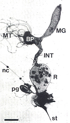 Das Präparat beginnt wieder mit dem Mitteldarm (MG, oben), nach links weist die „Bakterientasche“ (BP) mit einmündenden Malpighi-Gefäßen (MT) und Tracheen, nach unten folgen der Enddarm (INT) und das Rectum (R). (st) ist der Stachel. Nach links ist das Bauchmark zu erkennen (nc) und nahe der Stachelbasis die Giftdrüse (pg). (aus: Billen & Buschinger 2000).