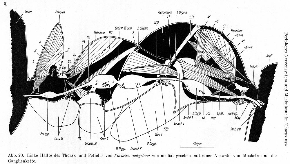 Hier also eine Zeichnung von Thorax inklusive Epinotum (Propodeum, Mittelsegment) und Petiolus (Schuppe) einer Arbeiterin von Formica polyctena. Alle Muskelstränge sind nummeriert (die Erläuterungen sind auf separaten Seiten), 1. und 2. Thorakalganglion (I Thggl) sind dargestellt, ebenso das 3., das mit dem Epinotalganglion verschmolzen ist.