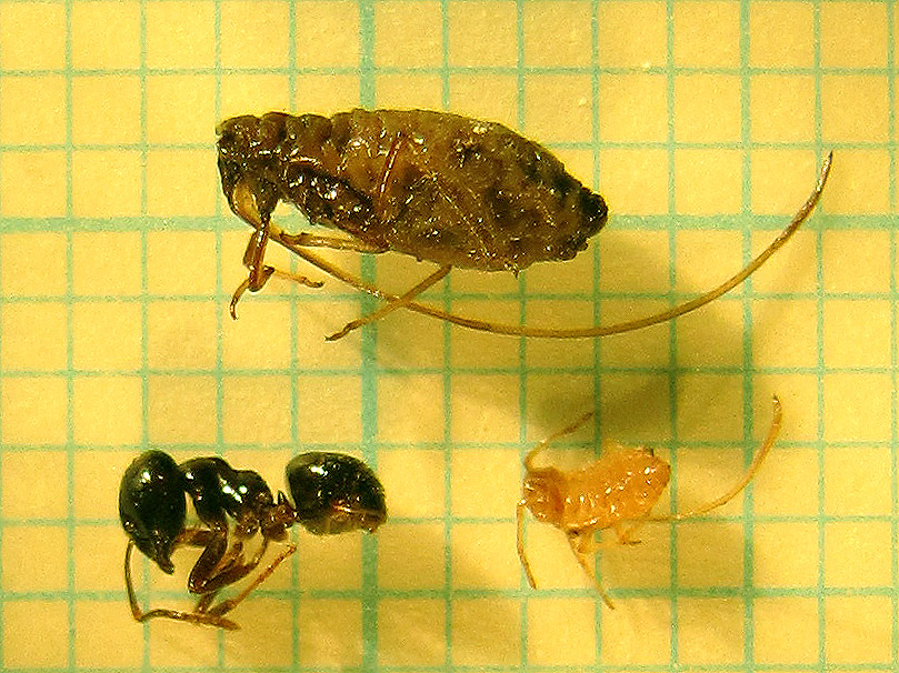 Hier habe ich ein ausgewachsenes Exemplar, eine junge Laus, und zum Größenvergleich eine Arbeiterin von Lasius fuliginosus aus meiner Sammlung fotografiert. Die kleine Laus liegt auf dem Bauch; der Rüssel reicht unter ihr hindurch bis über das Körperende hinaus.